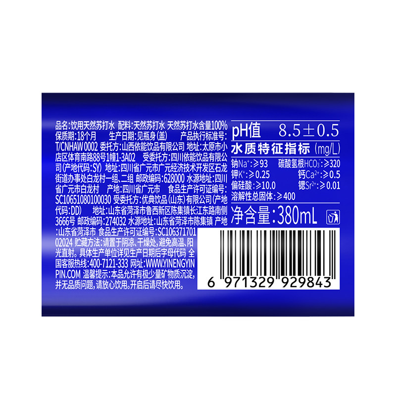 依能天然苏打水380ml*15瓶整箱装弱碱性饮用水无糖瓶装高端无气