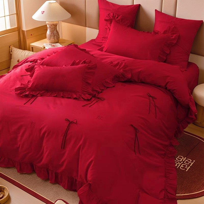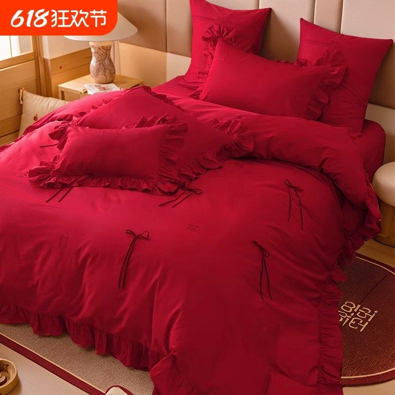 法式浪漫结婚四件套婚庆t被套大红色床单喜被罩高级感床上用品