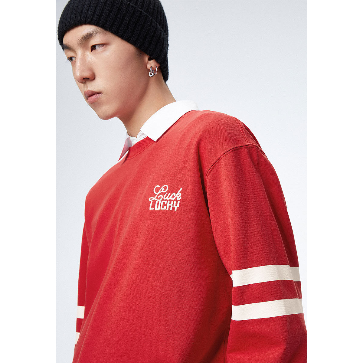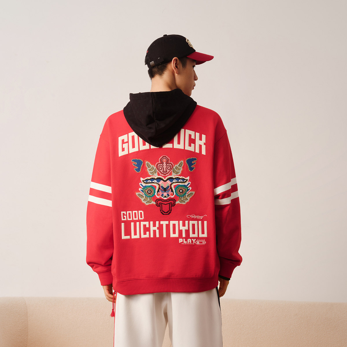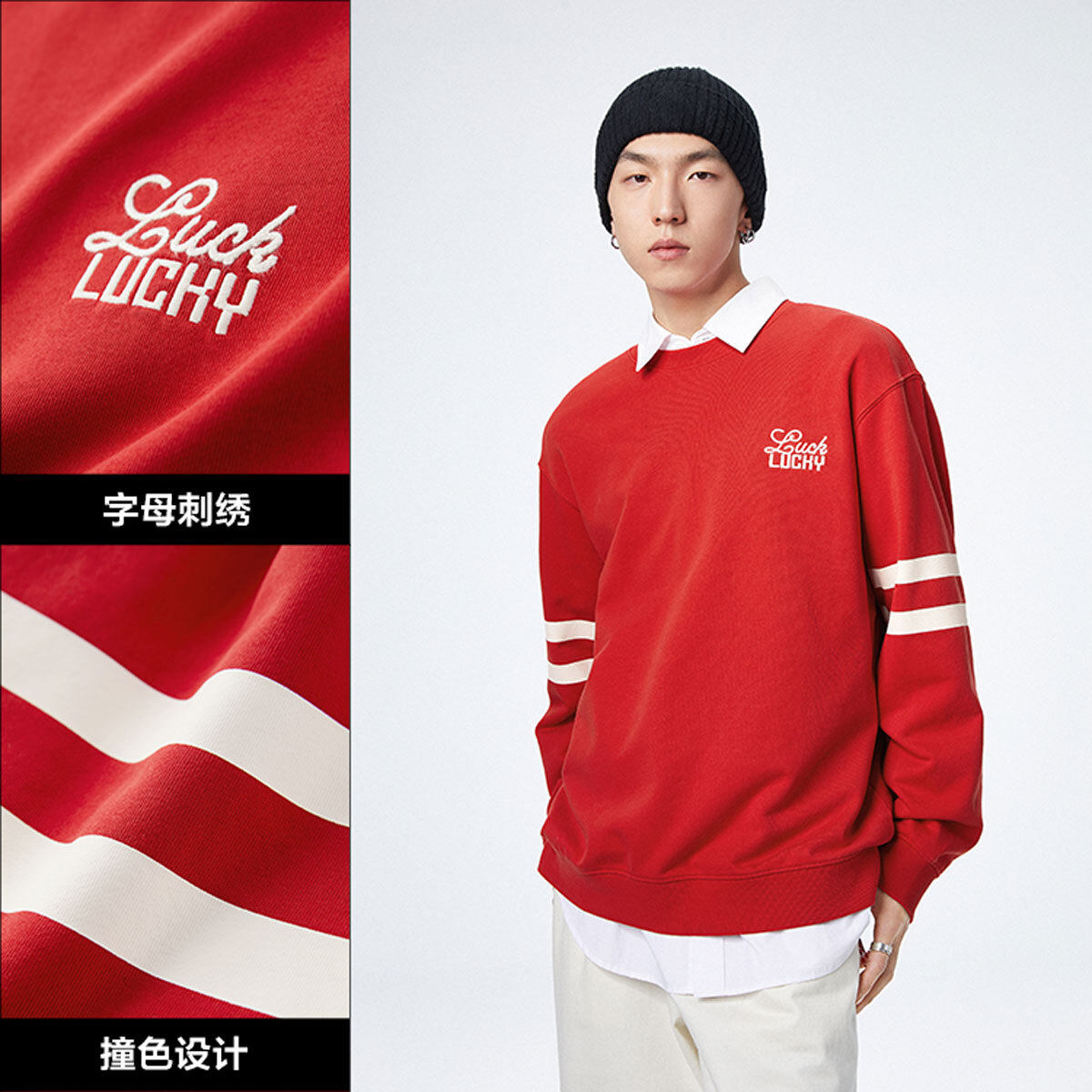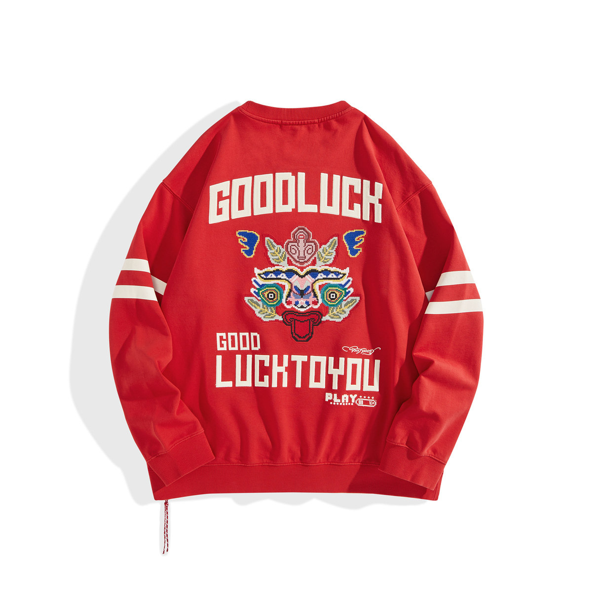 太平鸟男装龙纹十字绣红色卫衣新年本命年圆领上衣年衣潮流美式