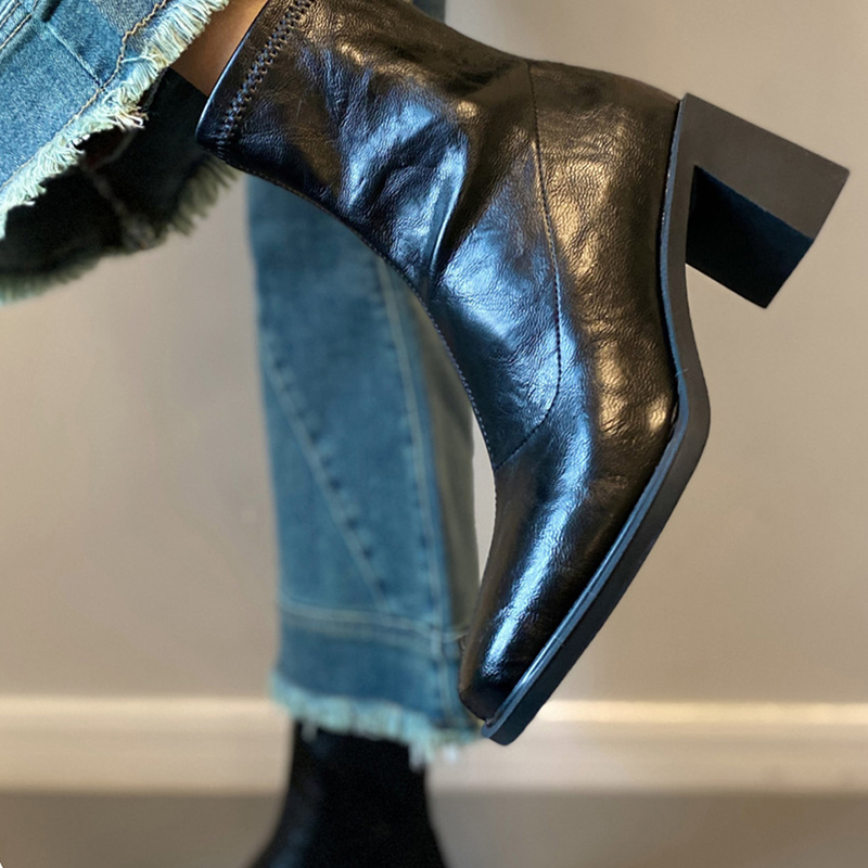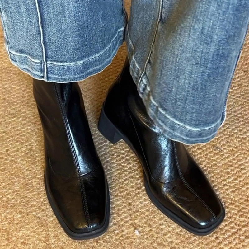 马丁靴女方头高跟短靴粗跟瘦瘦靴