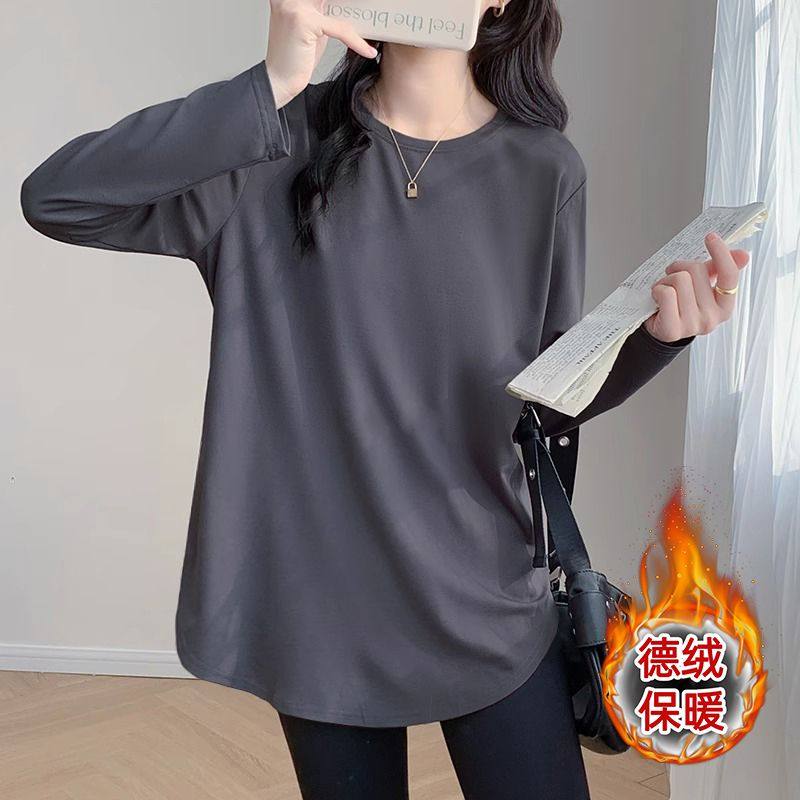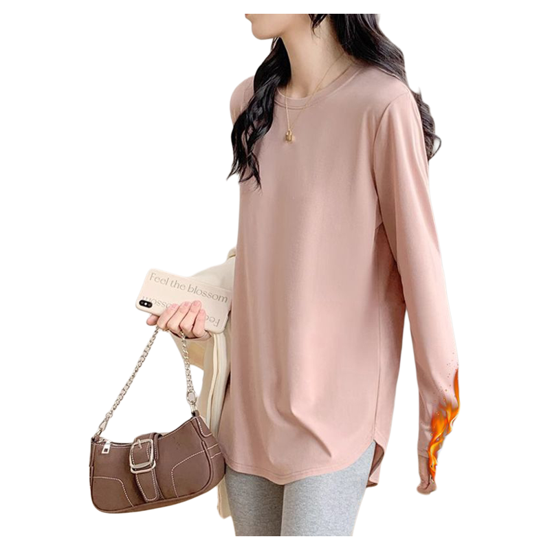 冬女长袖T恤双面打底衫宽松百搭纯色内搭加厚中长款下摆上衣