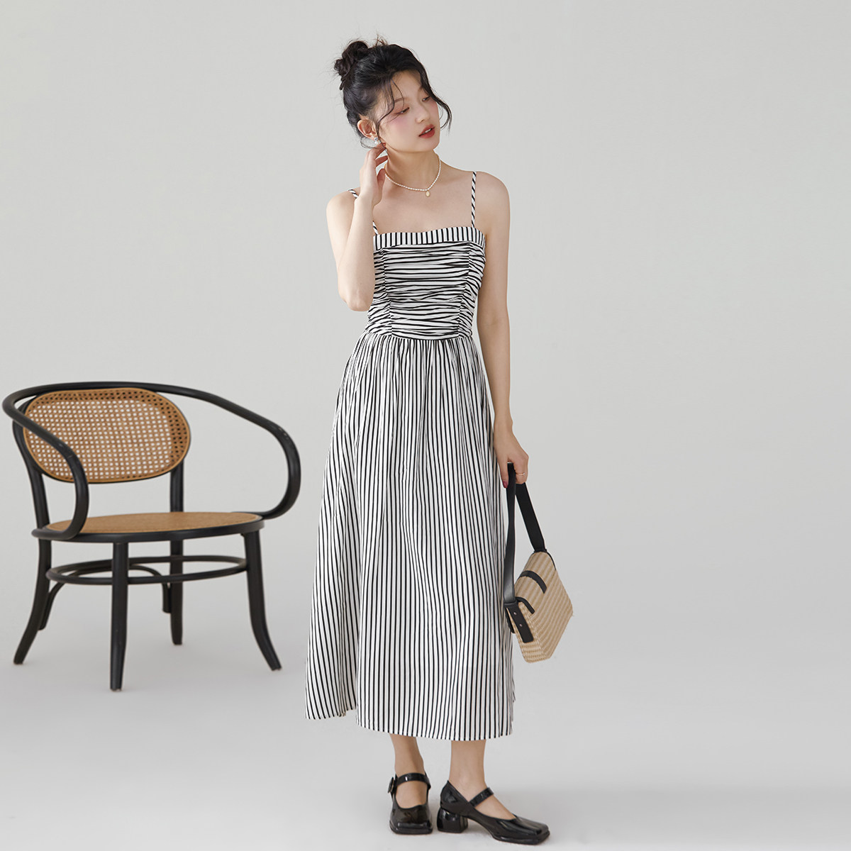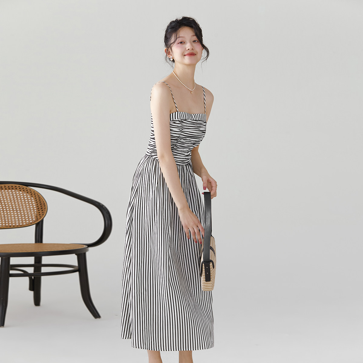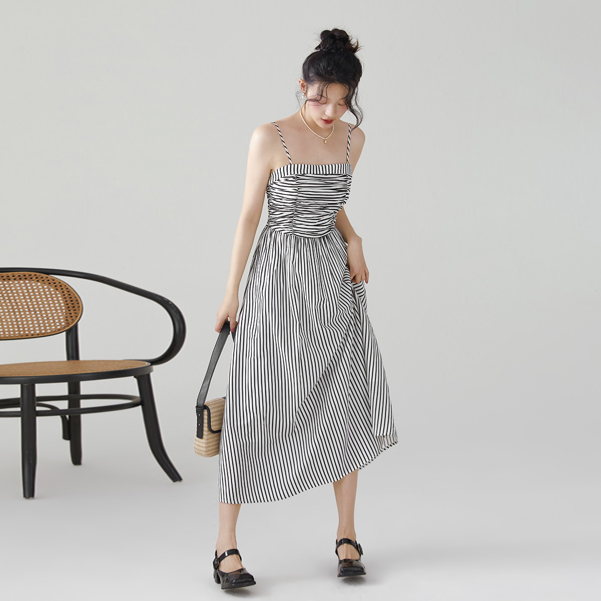 one more2025夏季新款修身一字领条纹吊带连衣裙女高级感抹胸长裙