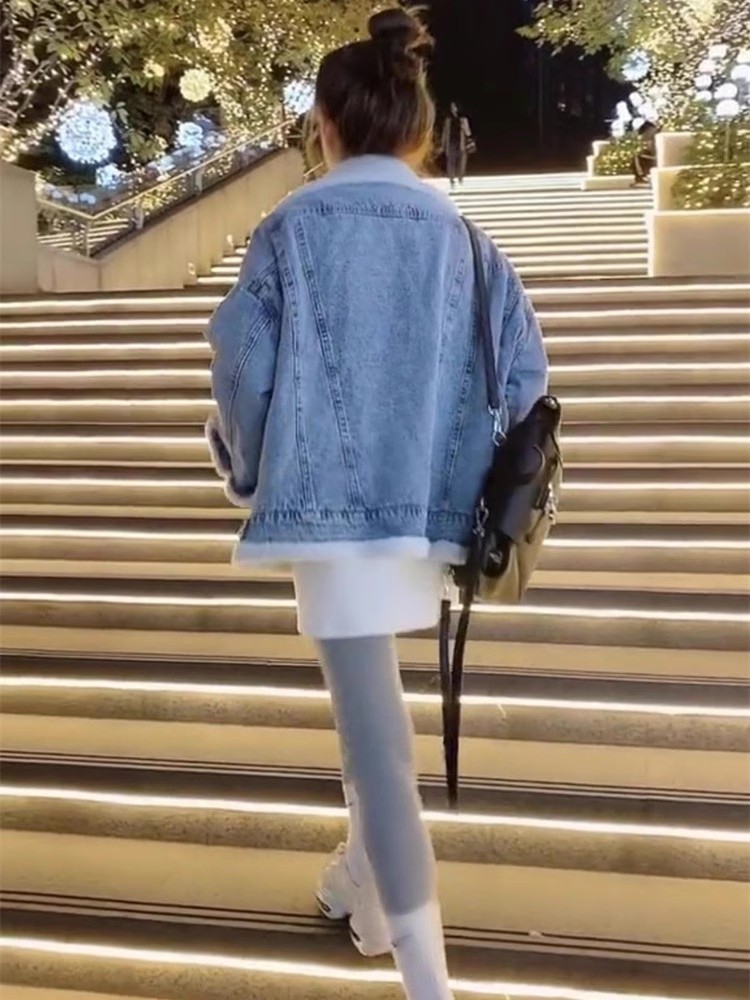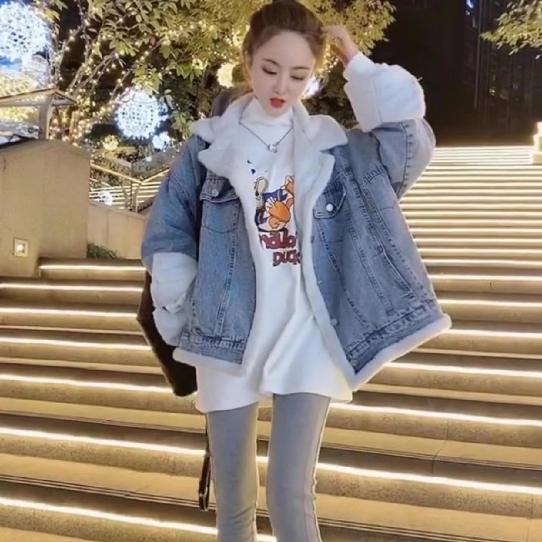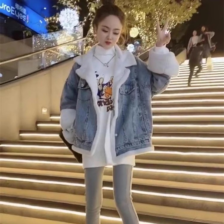 港风小个子冬季加绒加厚牛仔外套女学生百搭上衣韩版宽松棉衣棉服