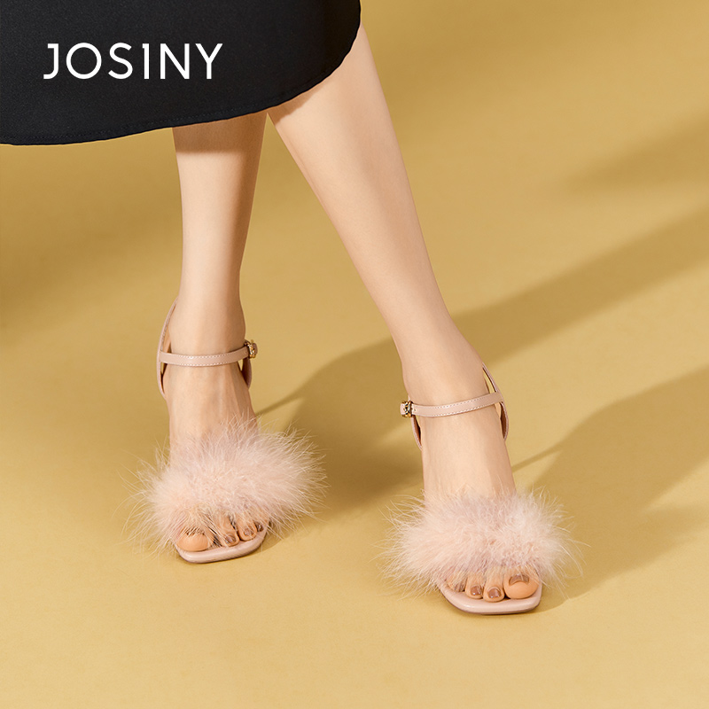 卓诗尼夏季女凉鞋撤柜正品女士气质一字带高跟鞋时尚毛毛凉鞋细跟