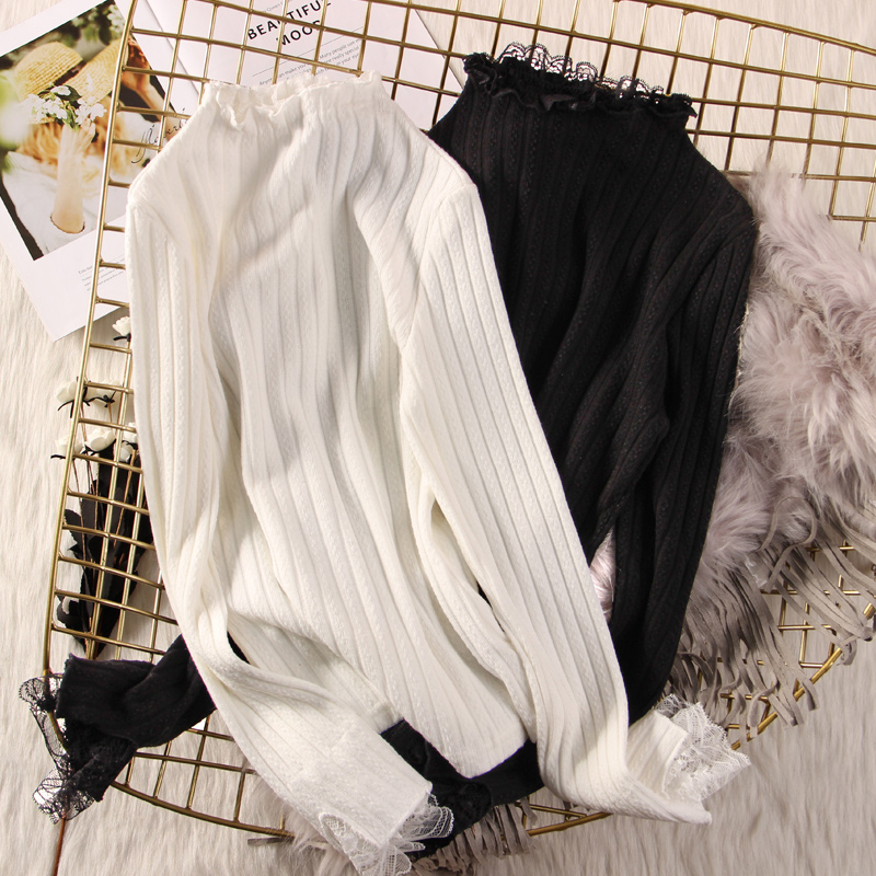 白色蕾丝领针织网纱打底衫女加绒秋冬新款内搭洋气高档小衫女上衣
