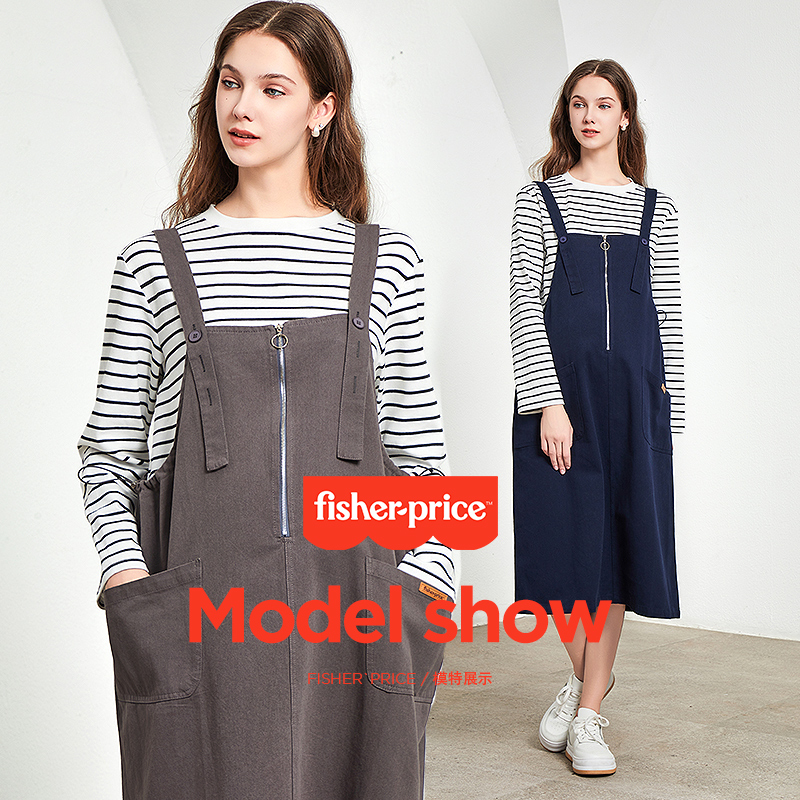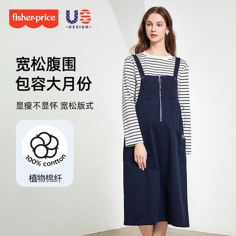 费雪孕妇连衣裙2025新款春秋条纹T恤上衣纯棉背带裙两件套装秋装