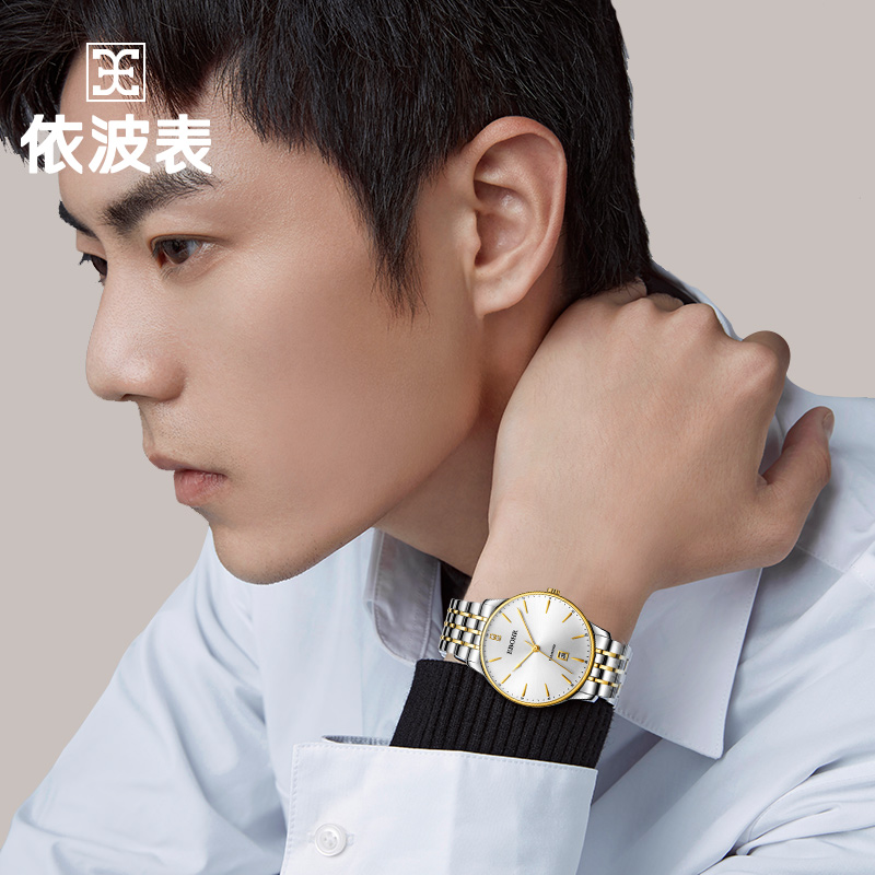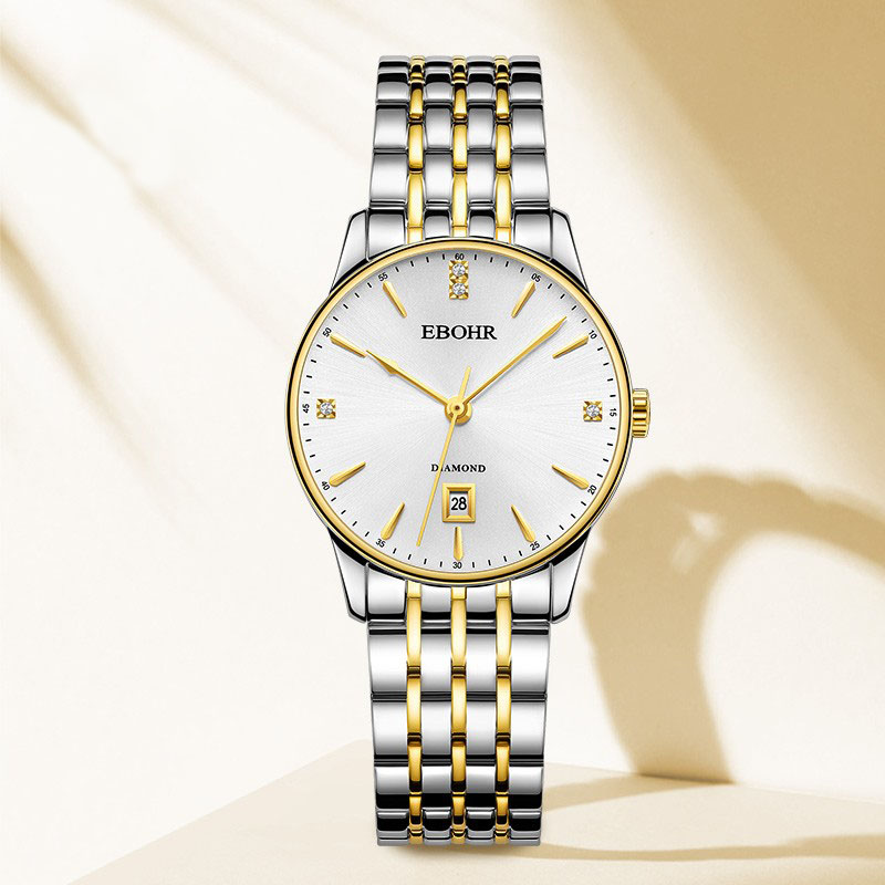 依波表(EBOHR)镶嵌真钻不锈钢石英表男表女表日历赠原装皮带2106
