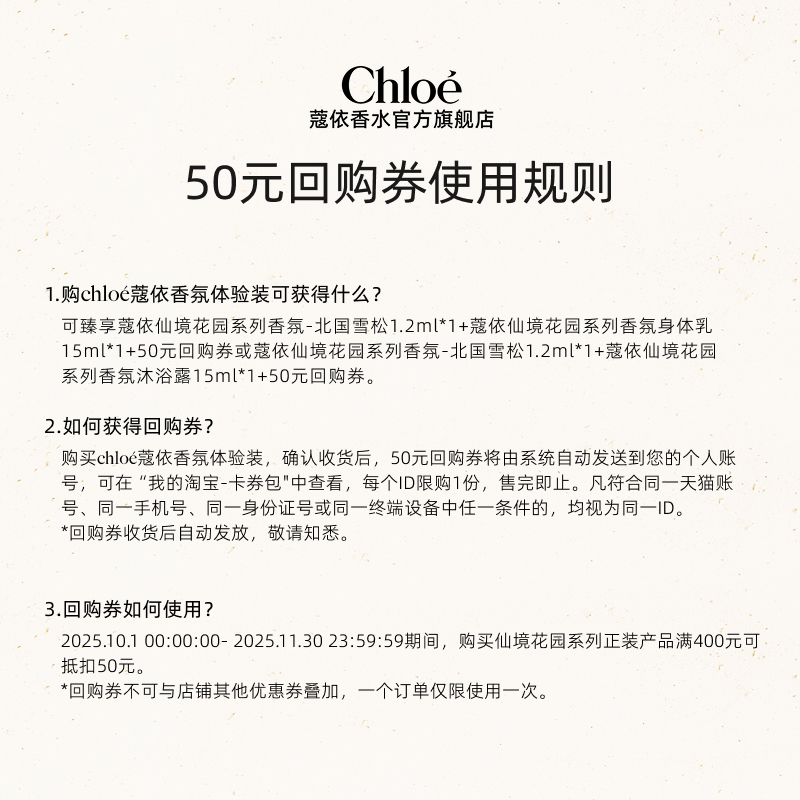 【小美盒】Chloe蔻依北国雪松1.2ml+沐浴露15ml+50元回购券