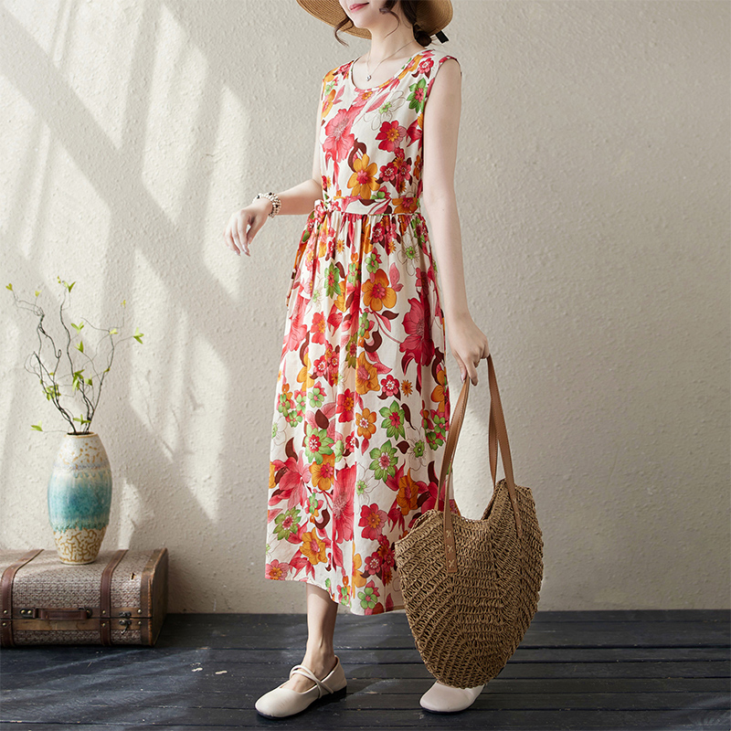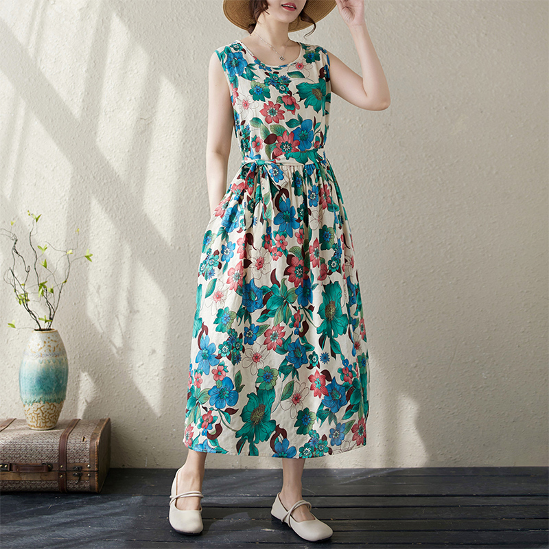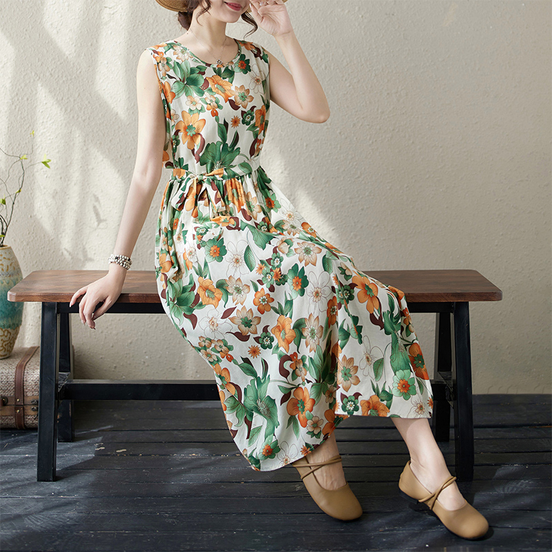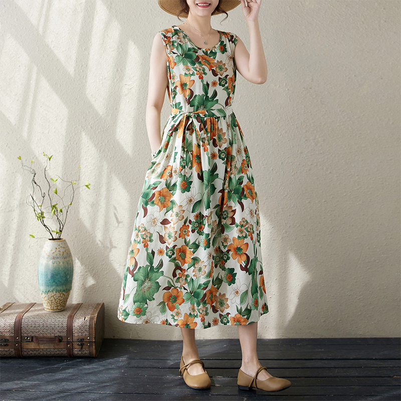 折扣春夏文艺复古棉麻连衣裙中长款女洋气无袖轻薄棉麻长裙子腰带