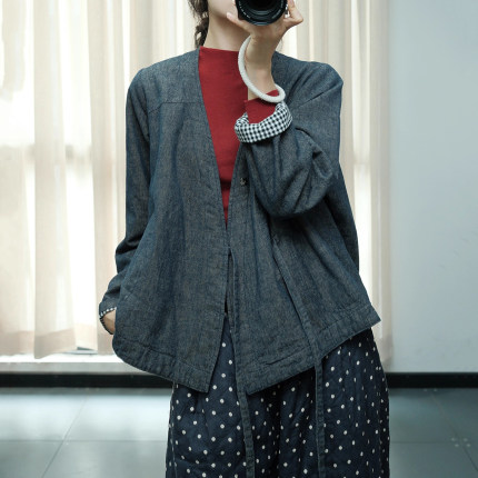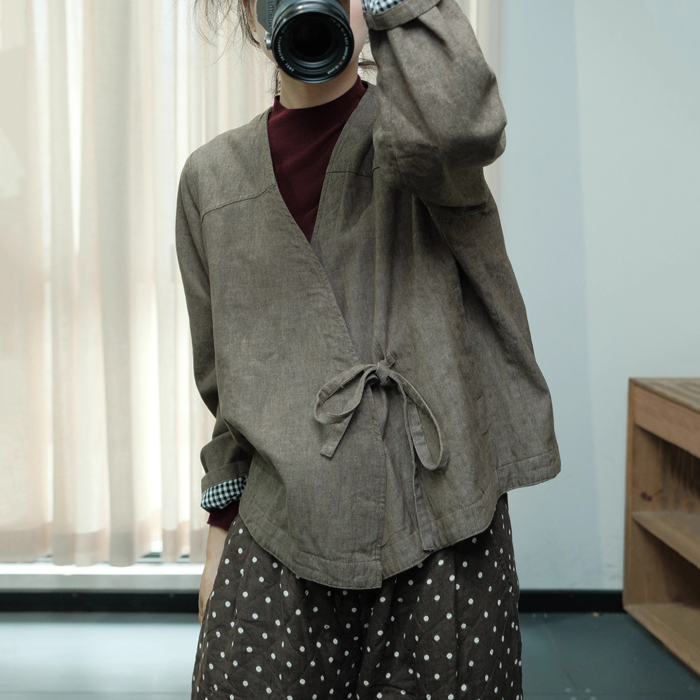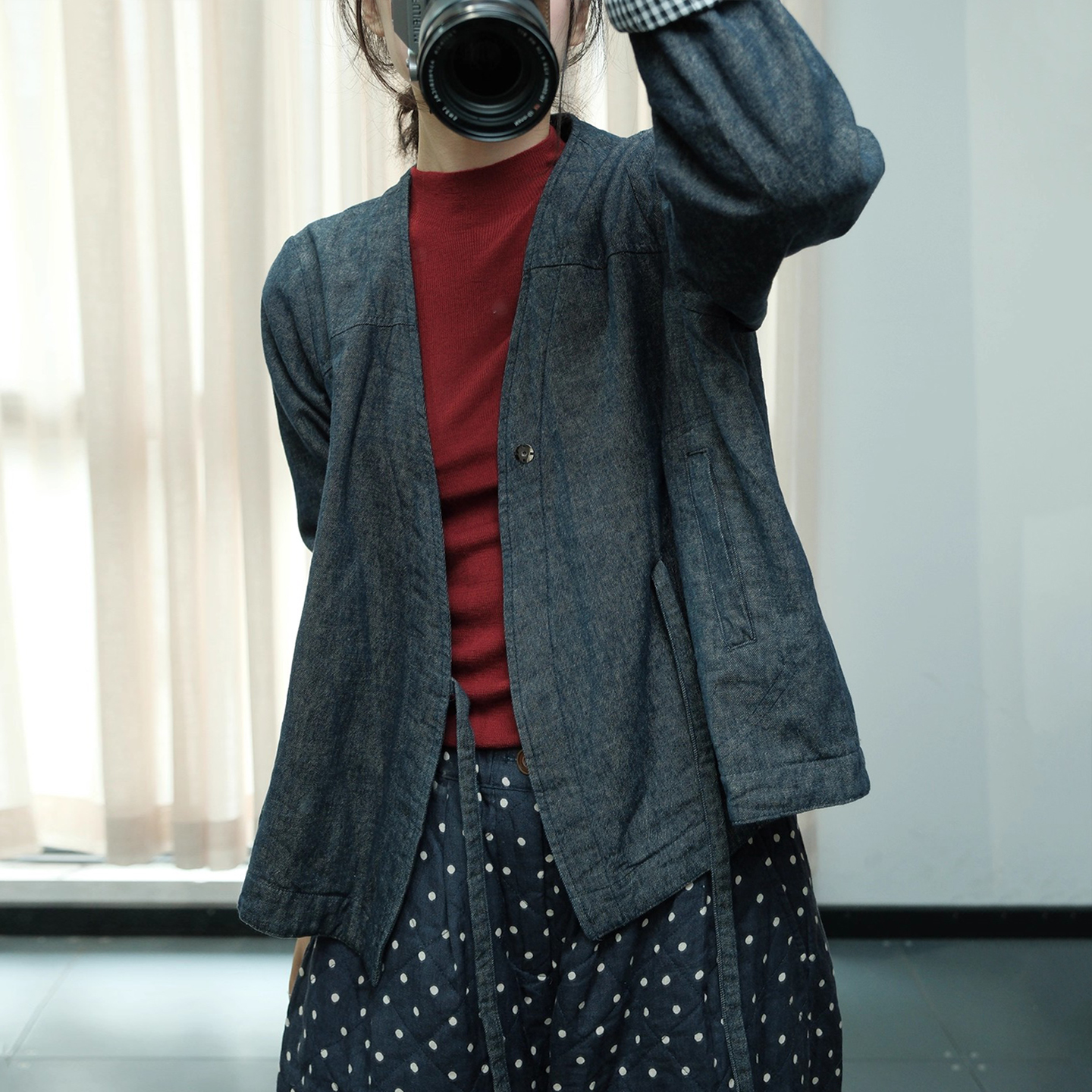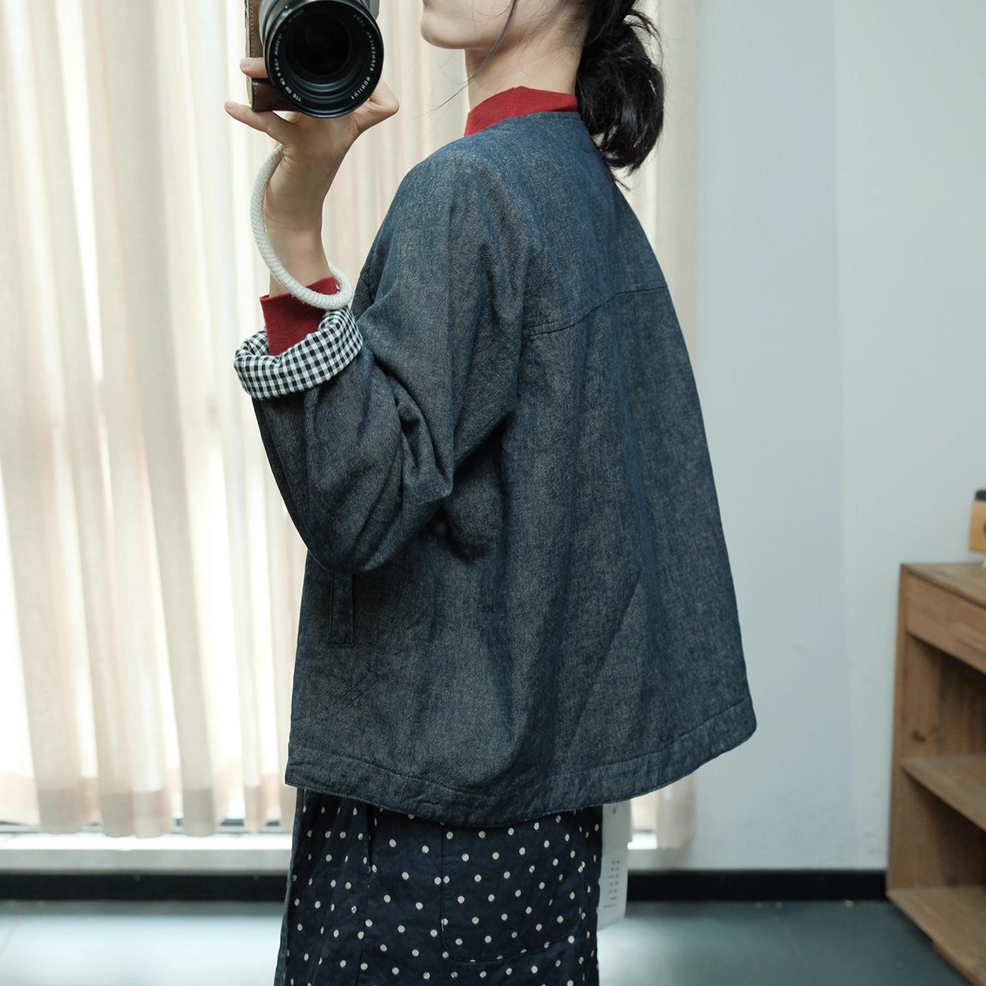 古与色文艺复古系带宽松大码长袖棉麻牛仔夹棉衬衣短外套棉服女冬