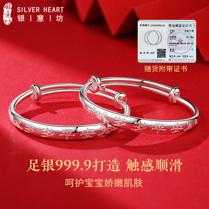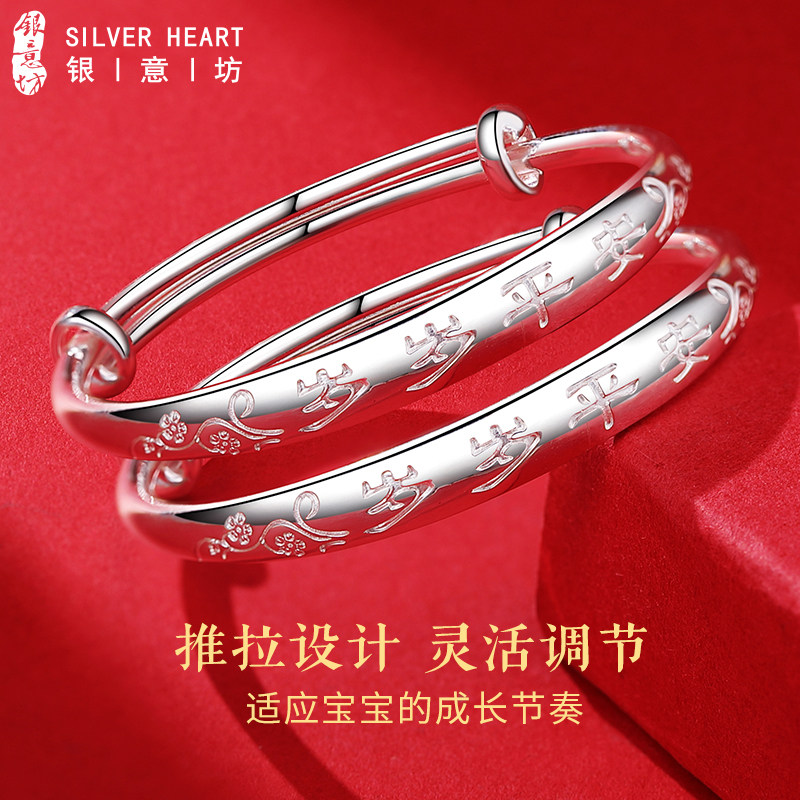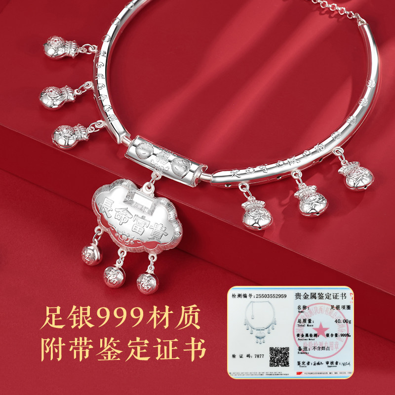 银手镯婴儿一对银项圈宝宝银饰三件套儿童小孩银锁纯银宝宝长命锁