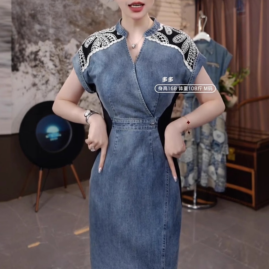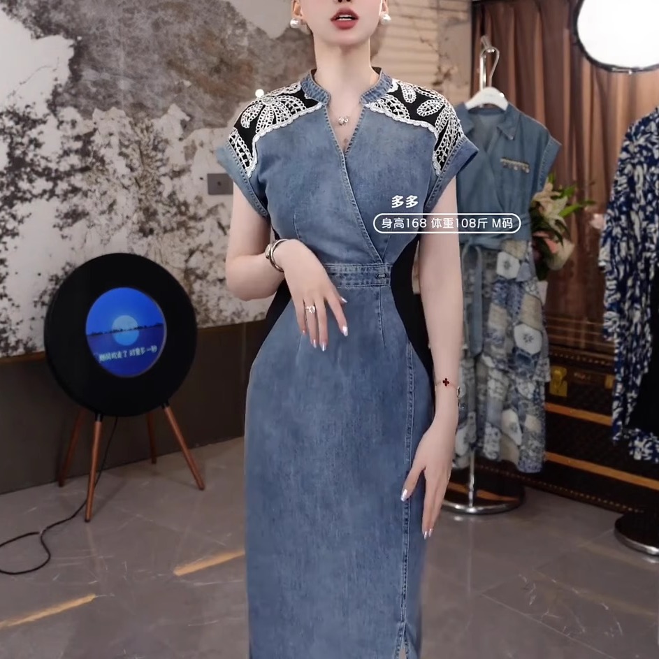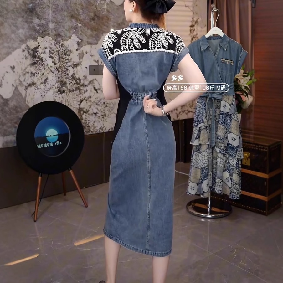 高端时尚重工刺绣拼接牛仔长裙女气质显瘦收腰高级感洋气连衣裙潮
