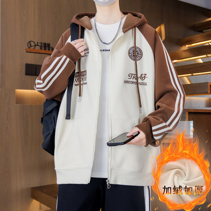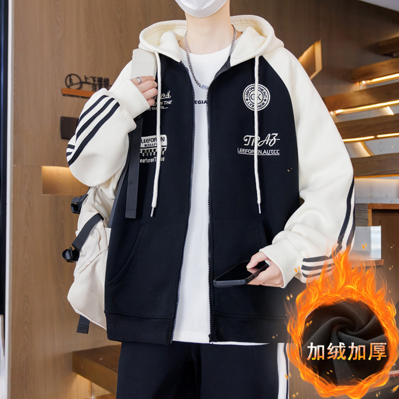 秋冬季连帽外套男孩初中学生帅气棒球服夹克青少年胖大童加绒上衣