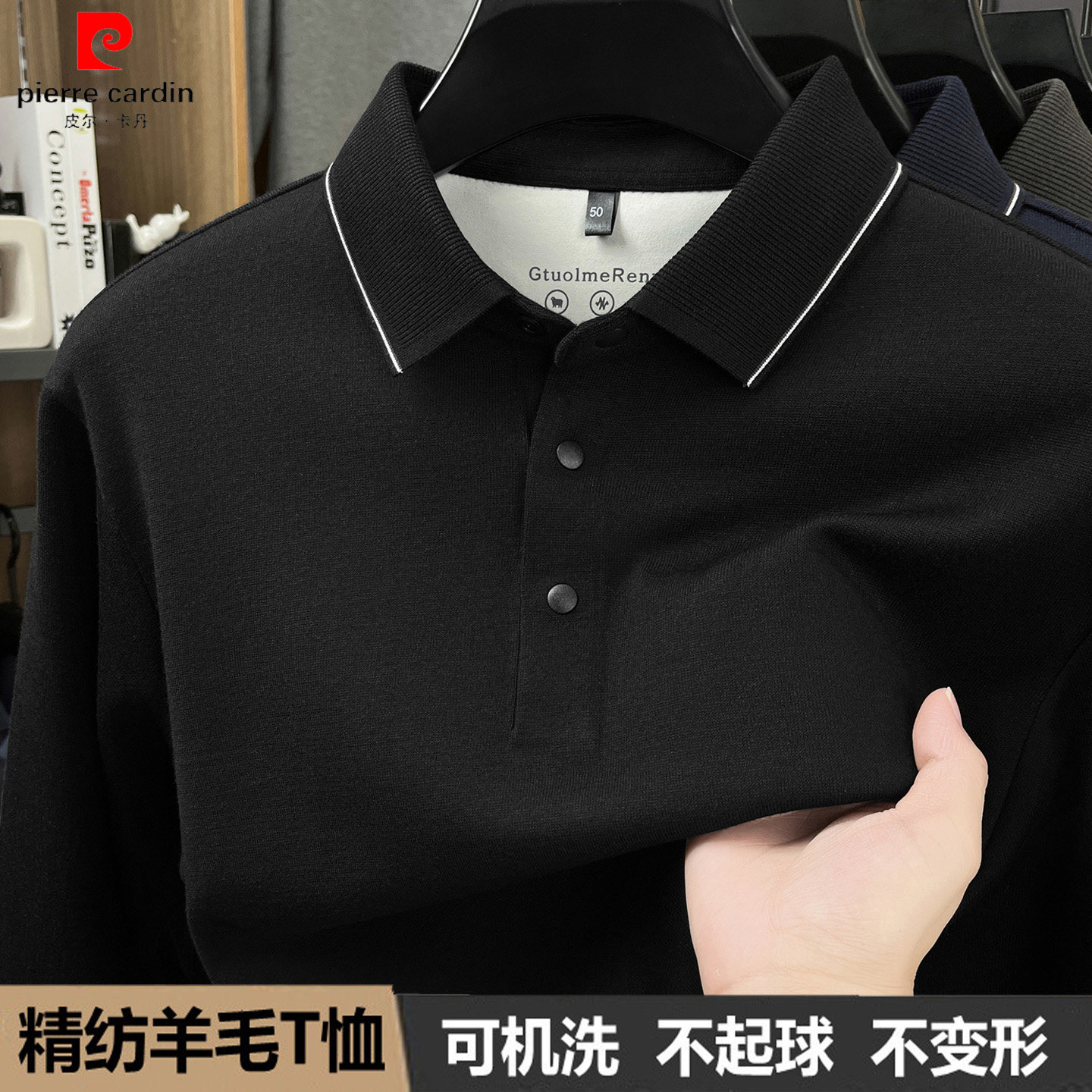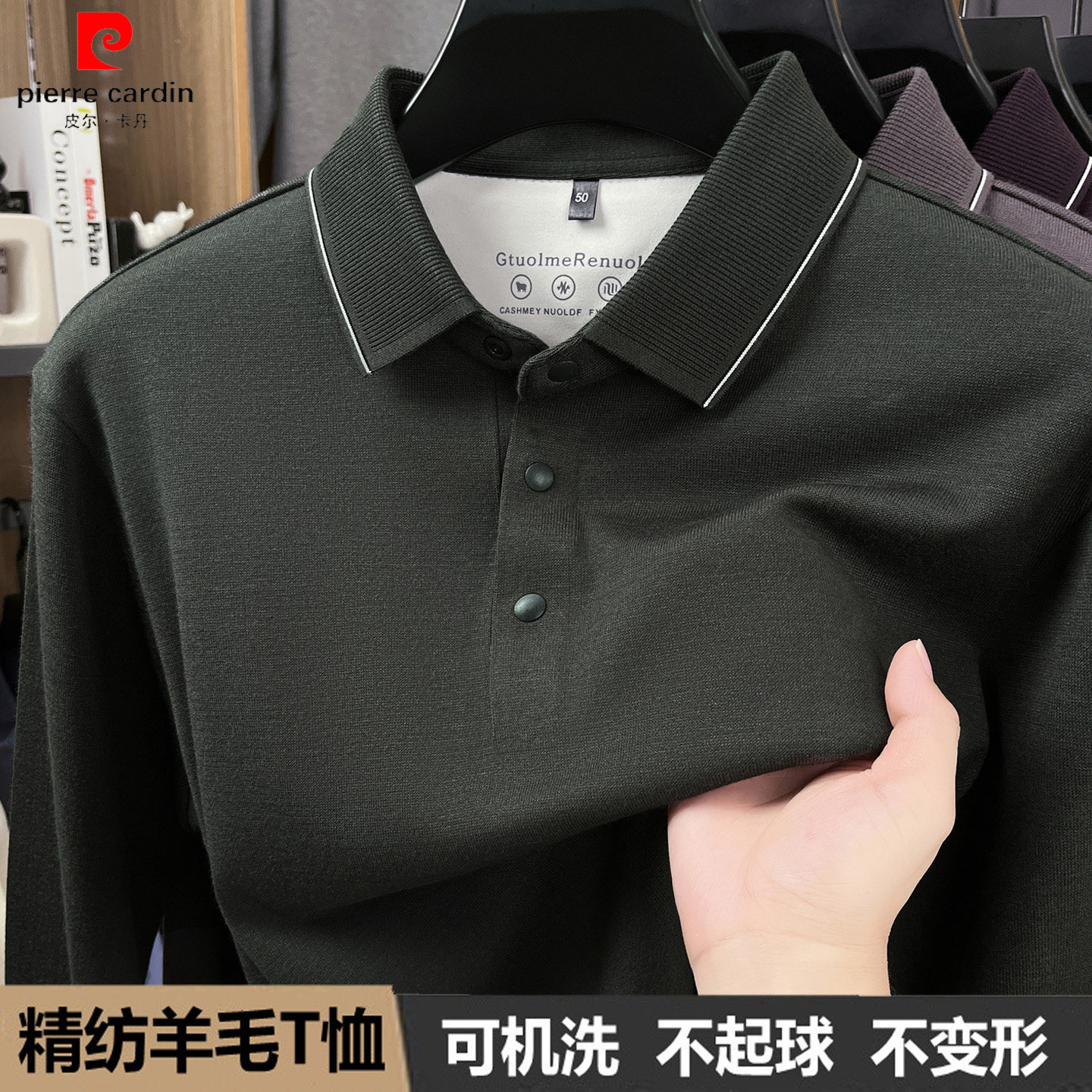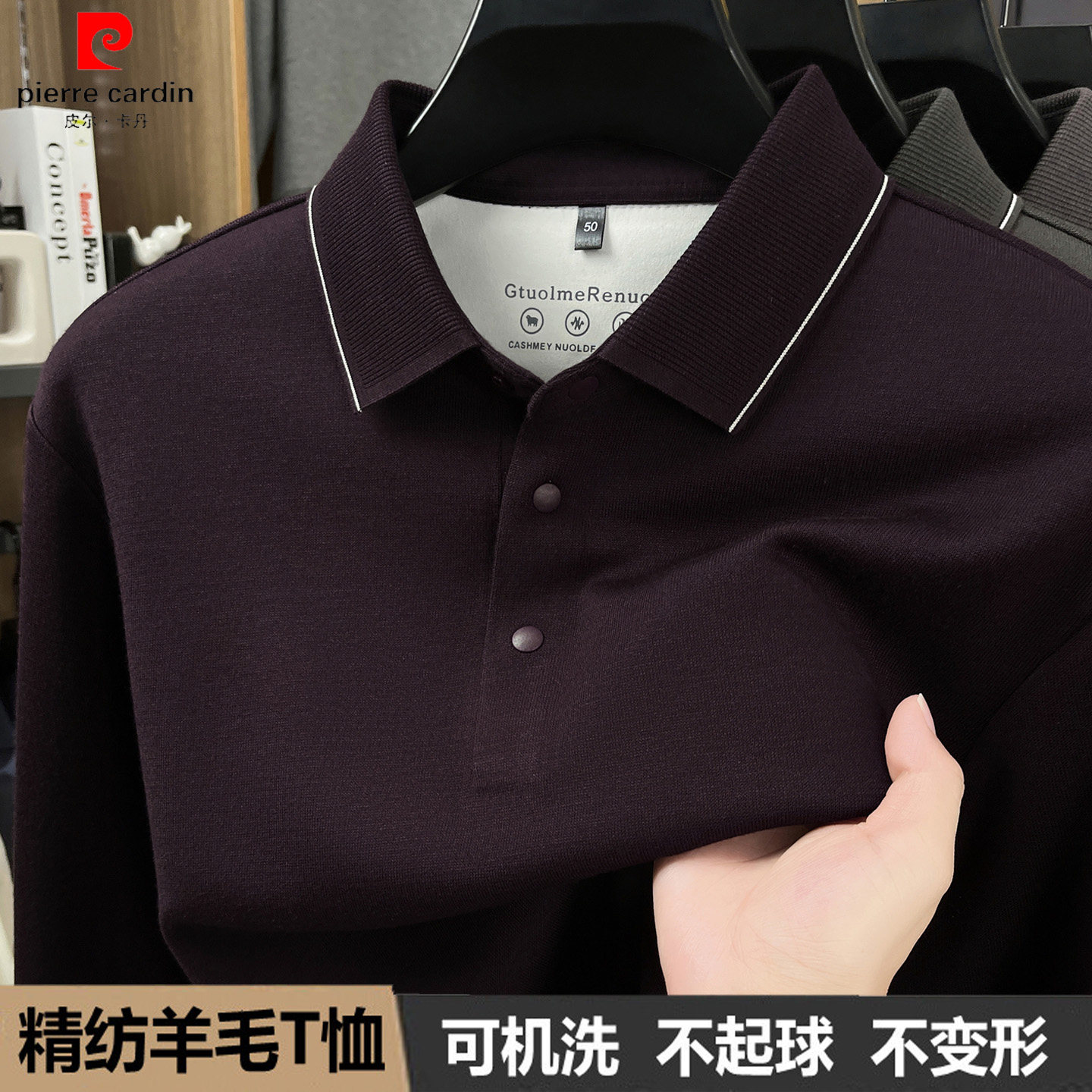 皮尔卡丹羊毛长袖t恤男士秋冬厚款休闲翻领POLO衫中年爸爸装上衣