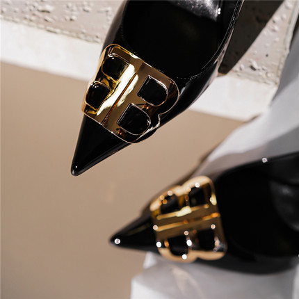 2025春季新款细跟尖头高跟鞋字母bb扣黑色漆皮百搭浅口气质单鞋