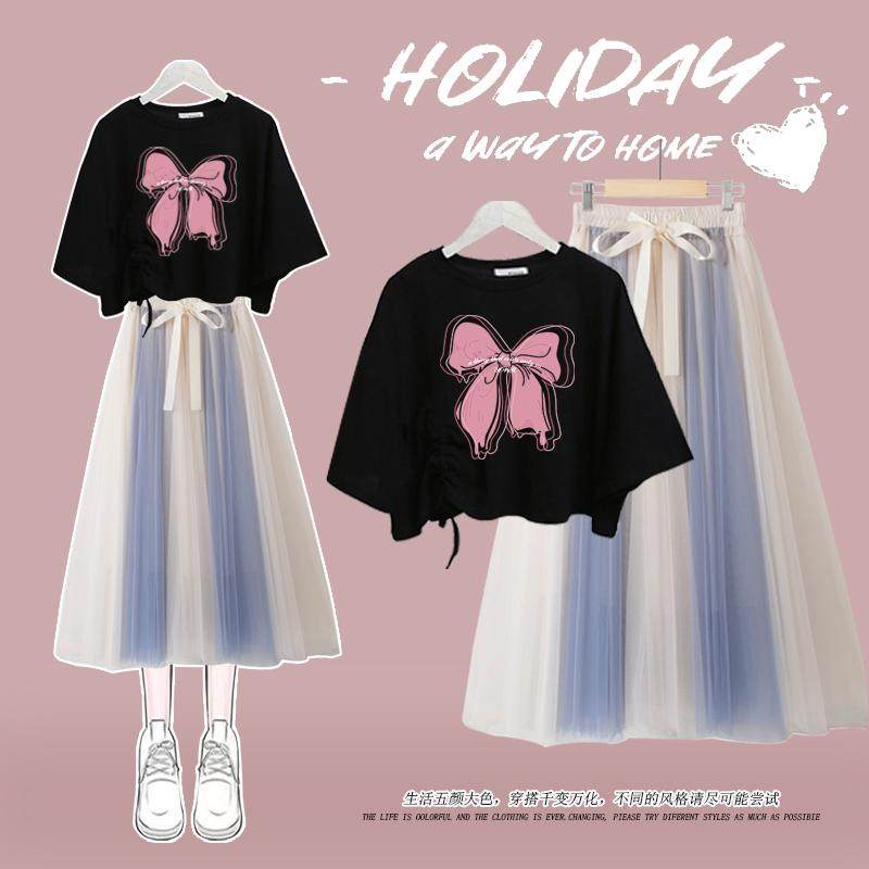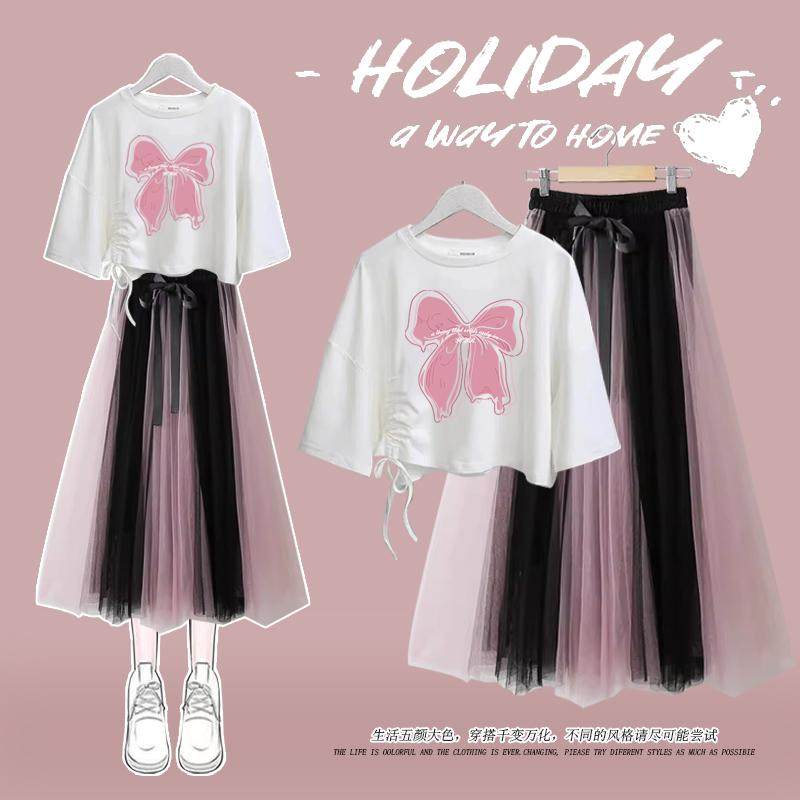 大童夏季新款蝴蝶结短袖T恤13岁15女孩16高中学生网纱半身裙套装