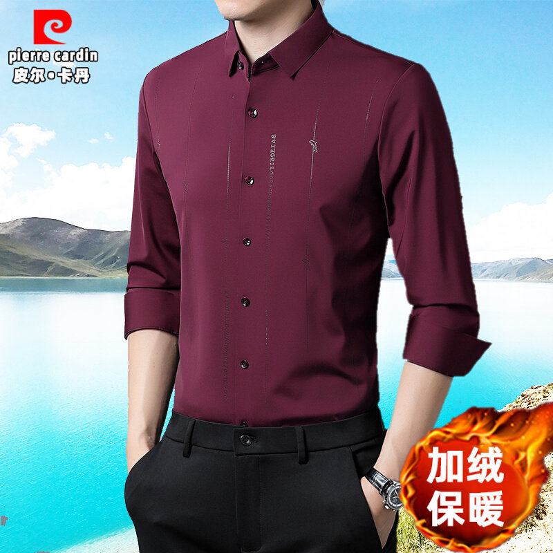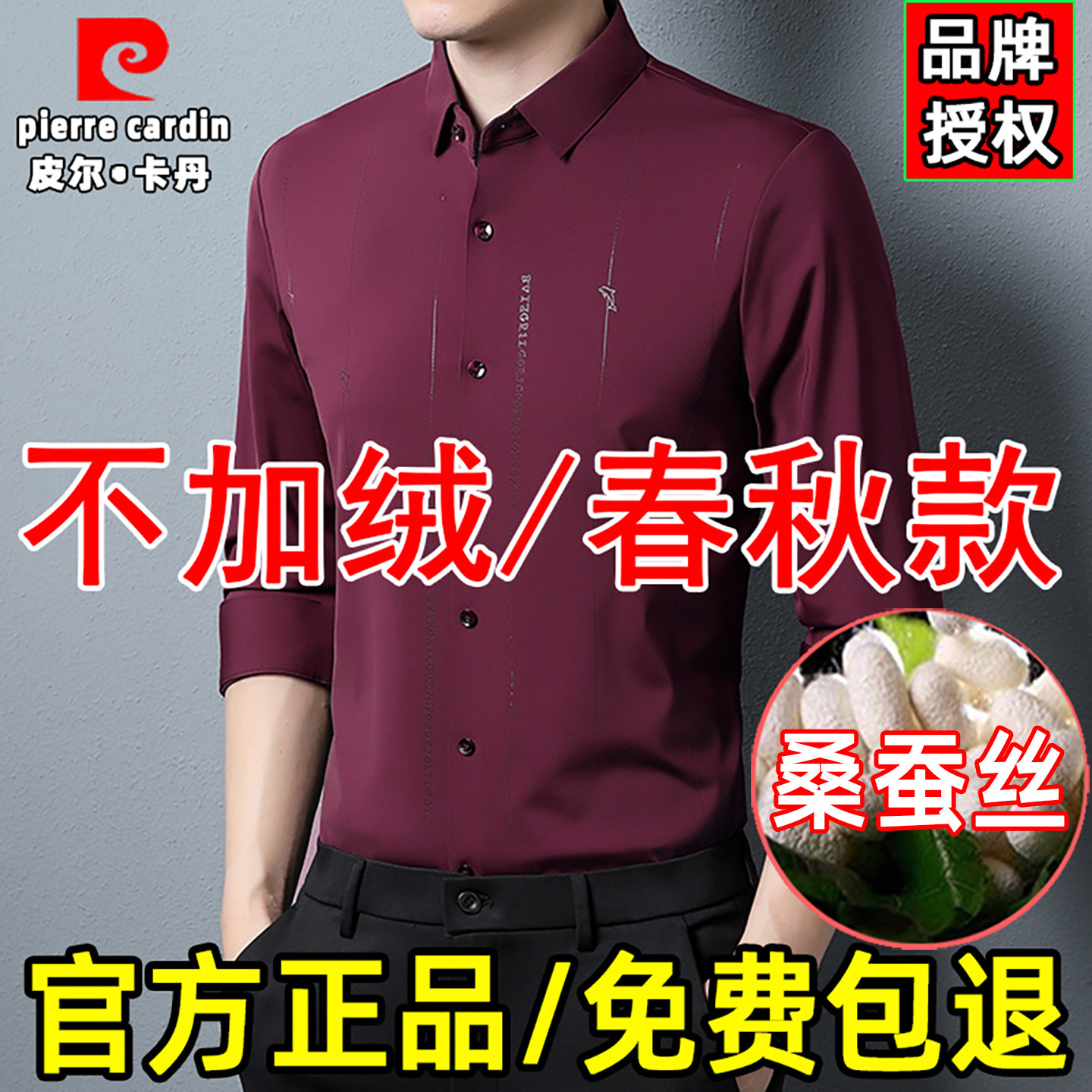 皮尔卡丹桑蚕丝长袖衬衫男士高端真丝秋冬新款中年爸爸装免烫衬衣