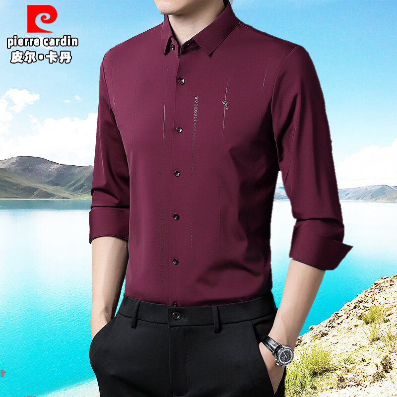 皮尔卡丹桑蚕丝长袖衬衫男士免烫