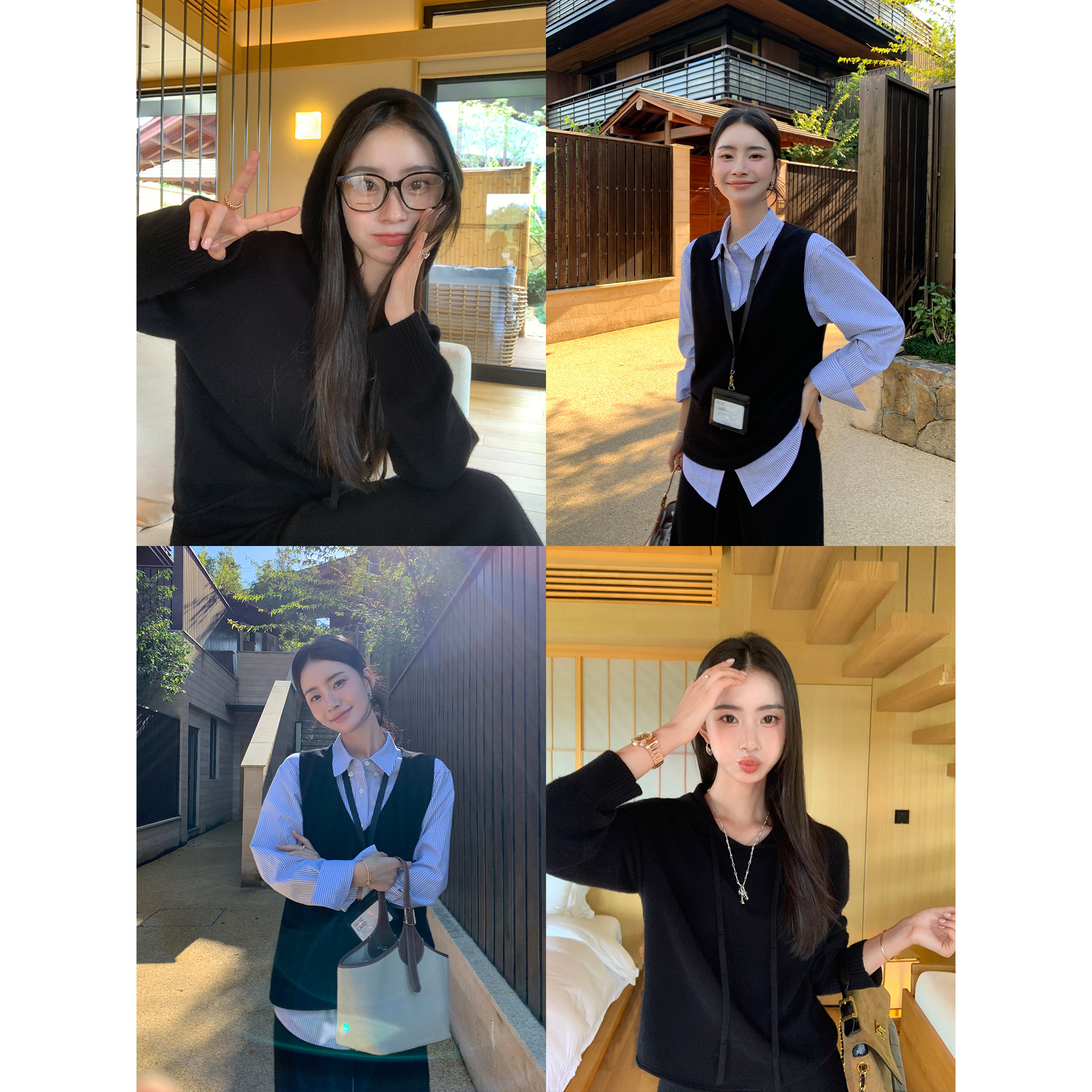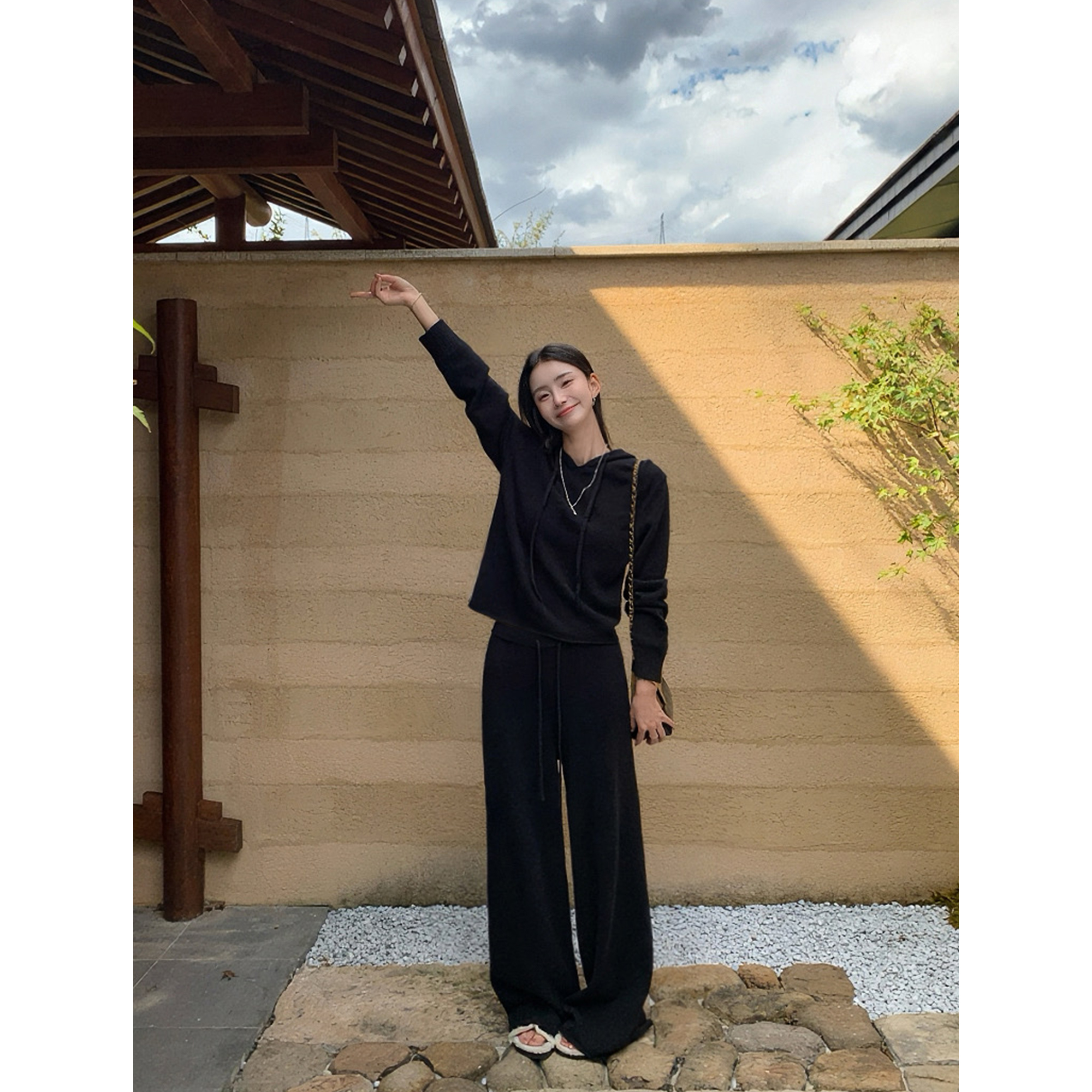pusumede随性松弛 100%羊毛慵懒毛织上衣女V领马甲宽松阔腿裤套装