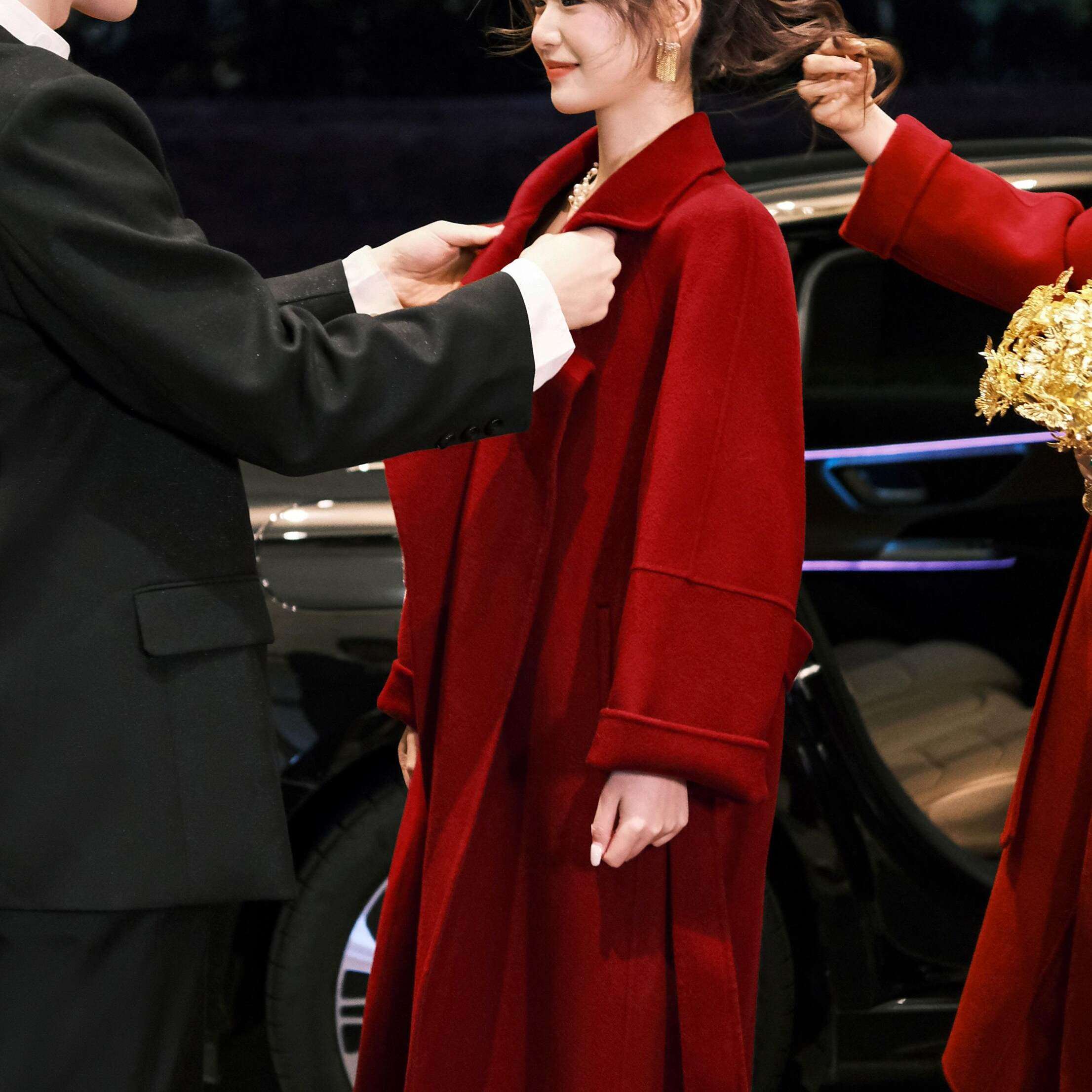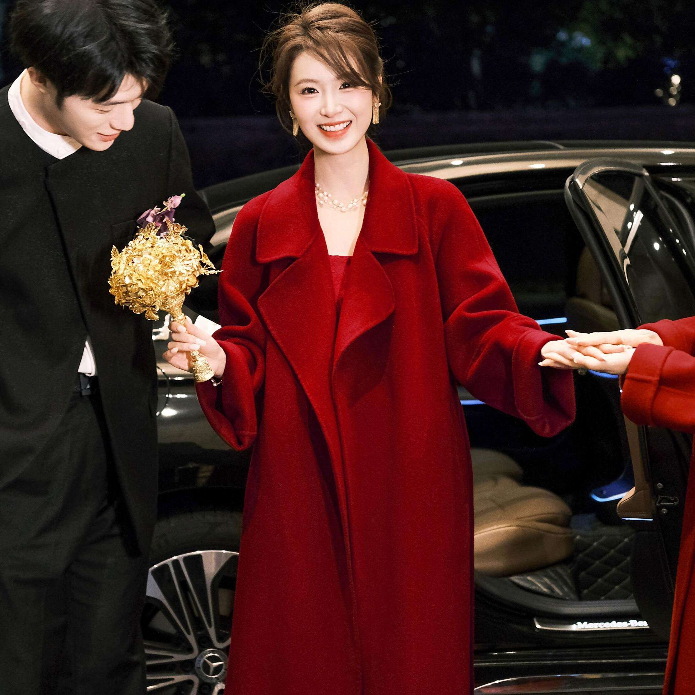 酒红色双面羊毛大衣女中长款过年跨年新娘结婚敬酒服回门毛呢外套