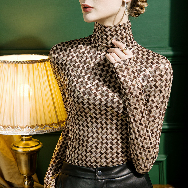 2025秋季新款高领蕾丝打底衫女印花格子洋气长袖春秋内搭上衣小衫