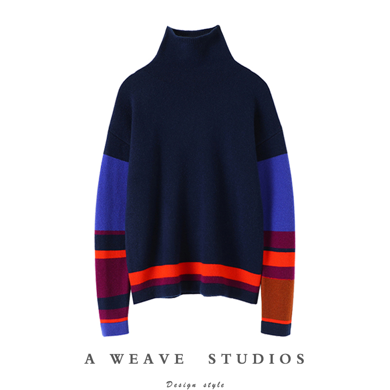 格外显肤白!撞色高领山羊绒衫女纯羊绒毛衣针织打底衫宽松秋冬