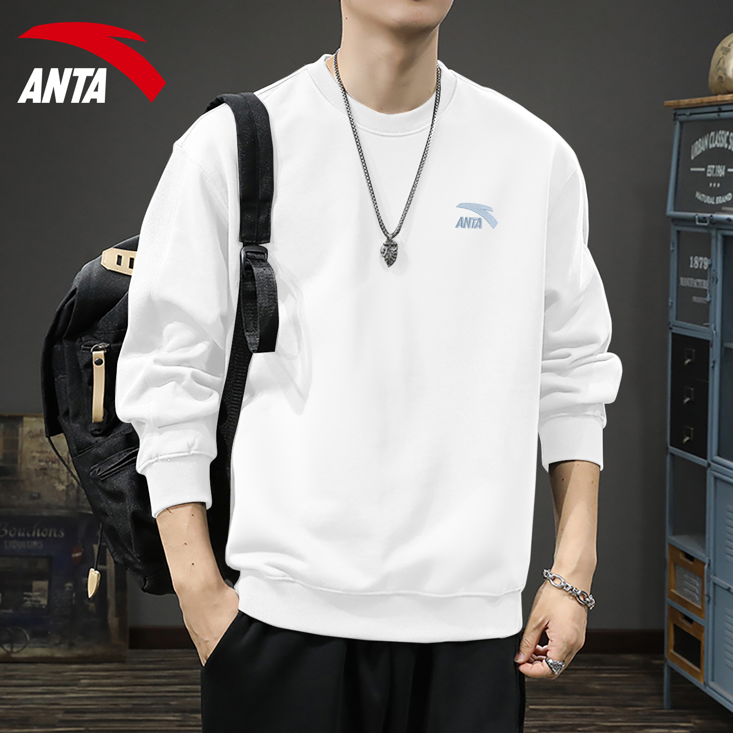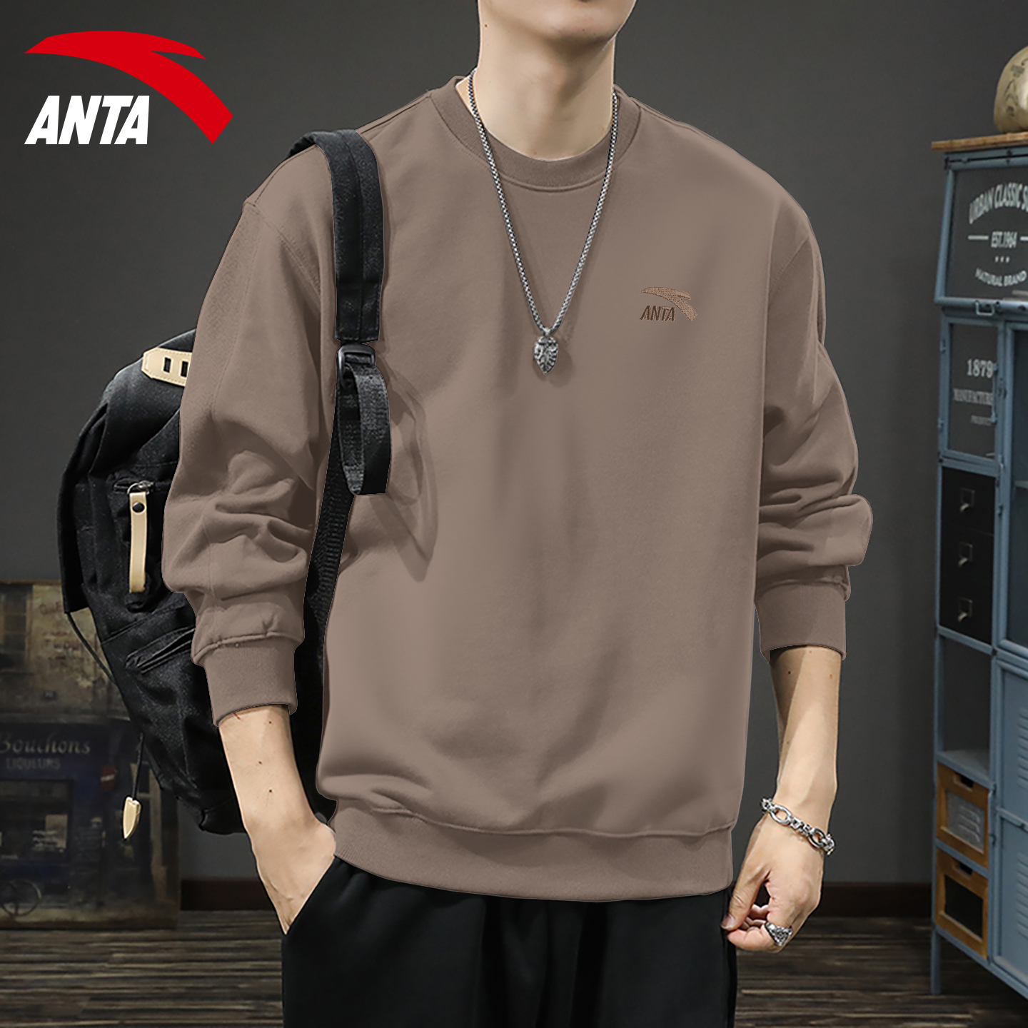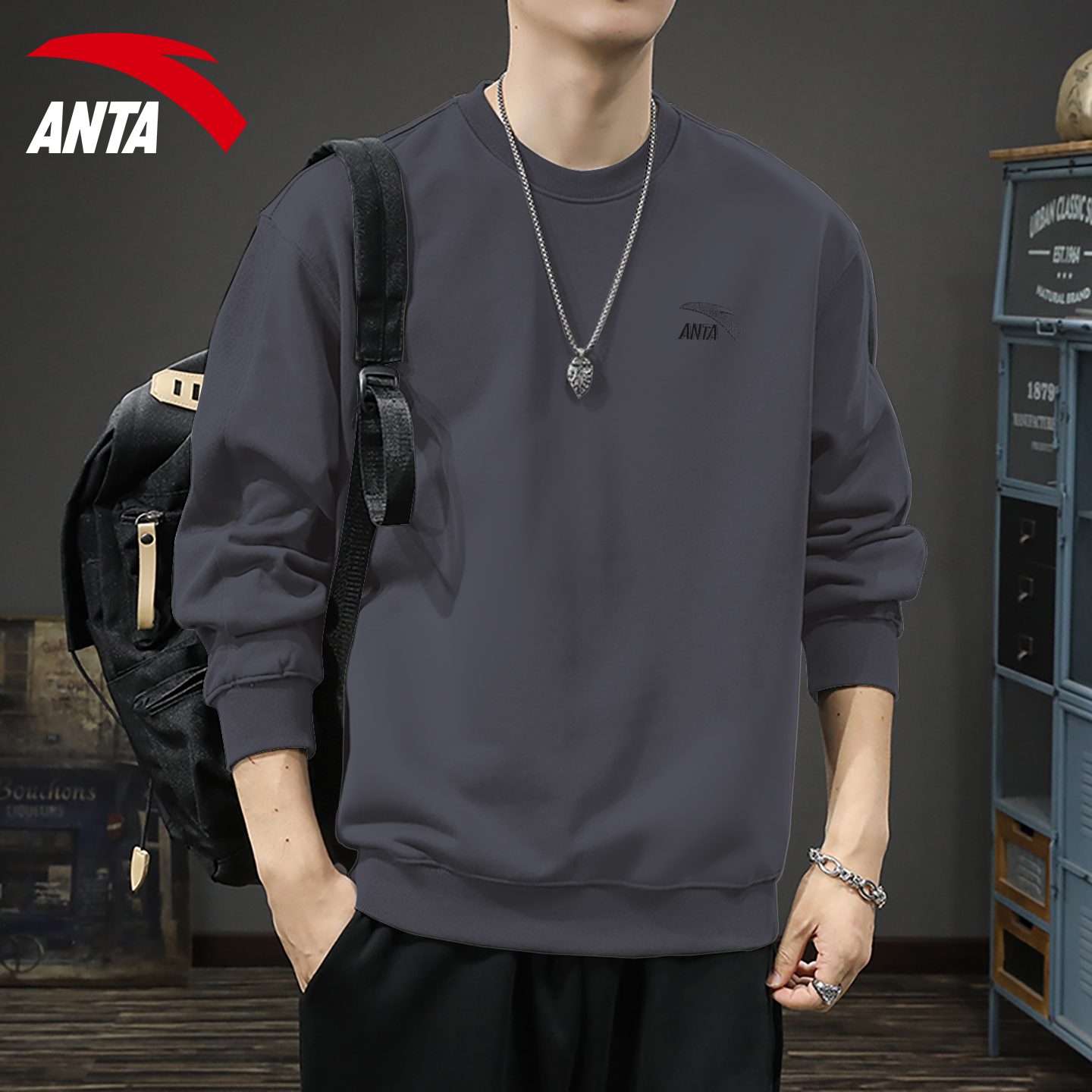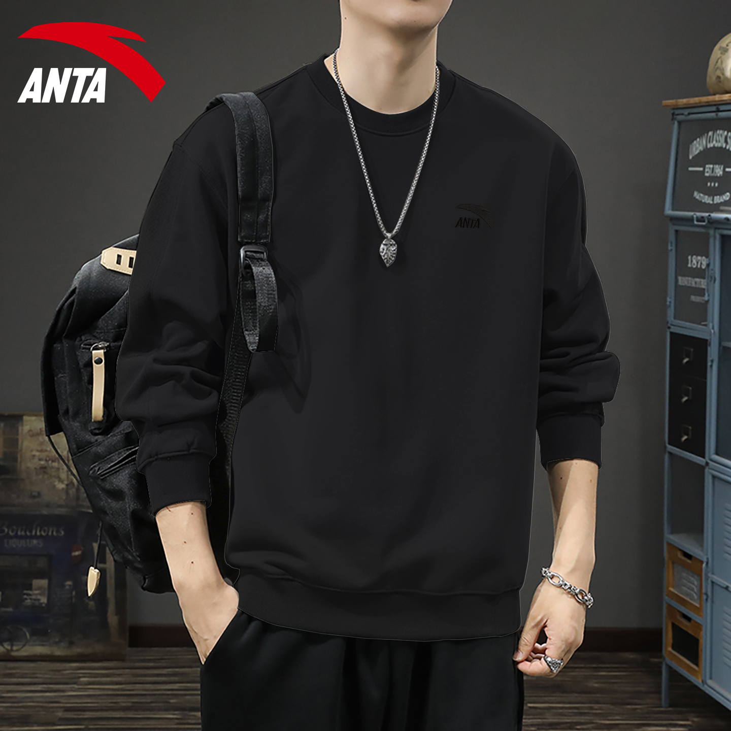 安踏卫衣男美式秋冬长袖T恤复古圆领刺绣大码宽松加绒内搭套头衫