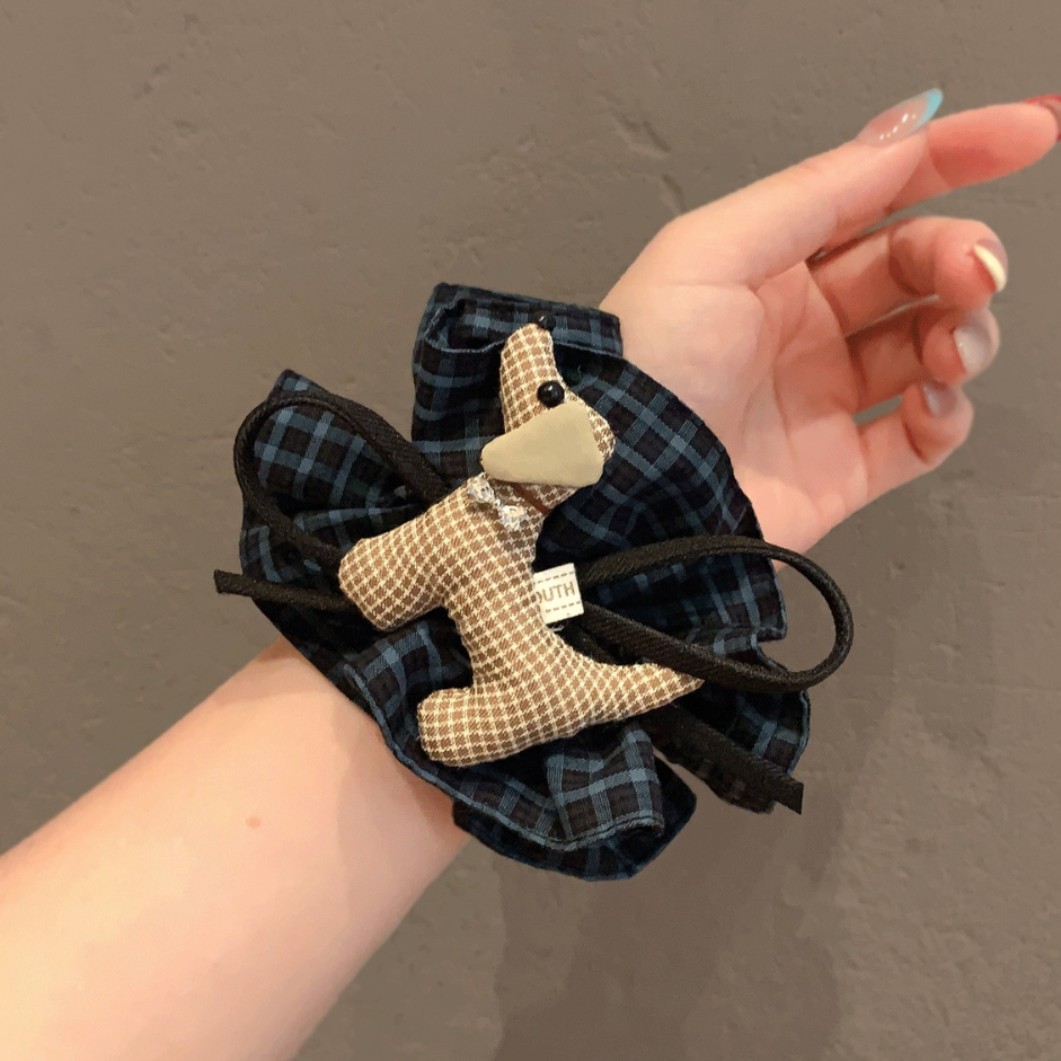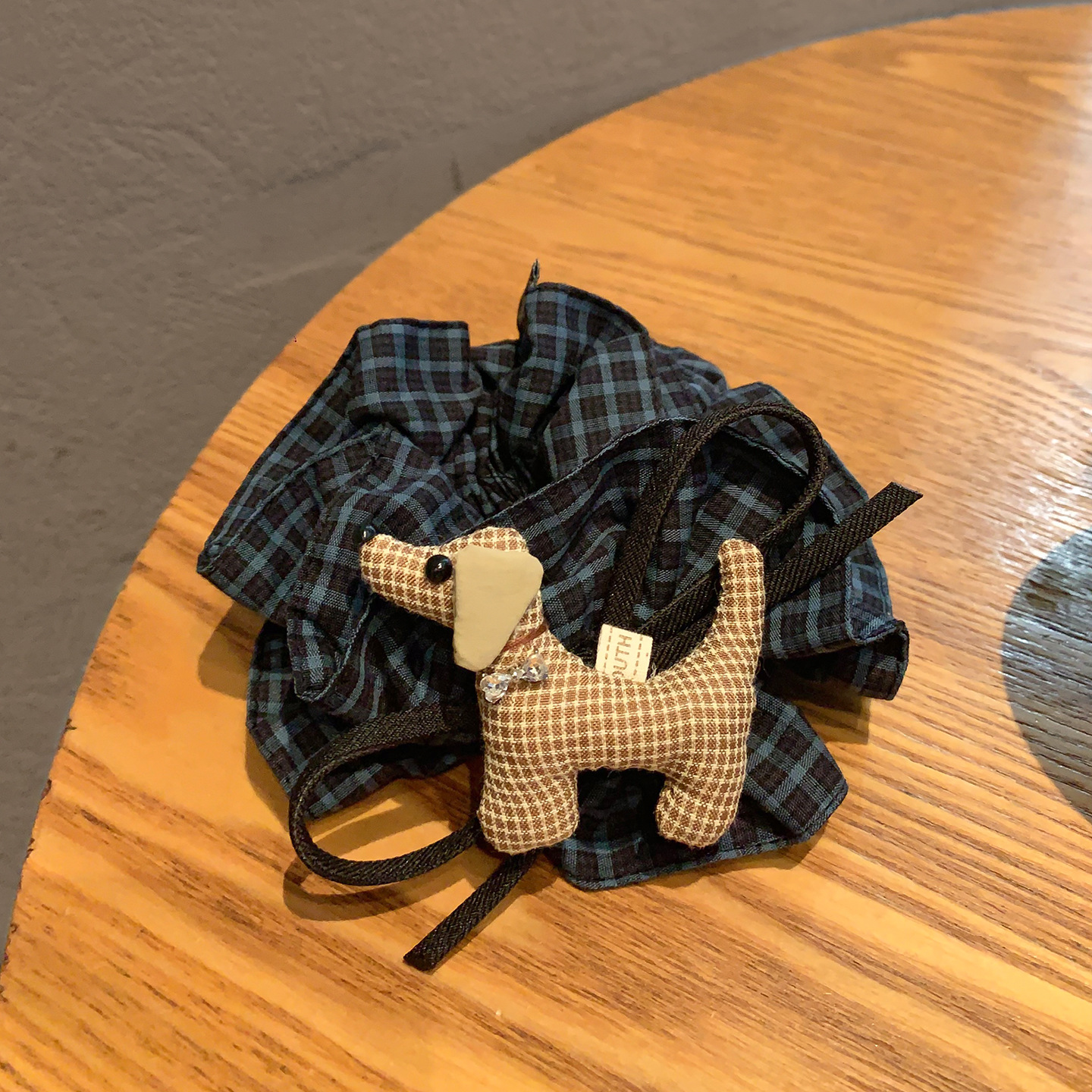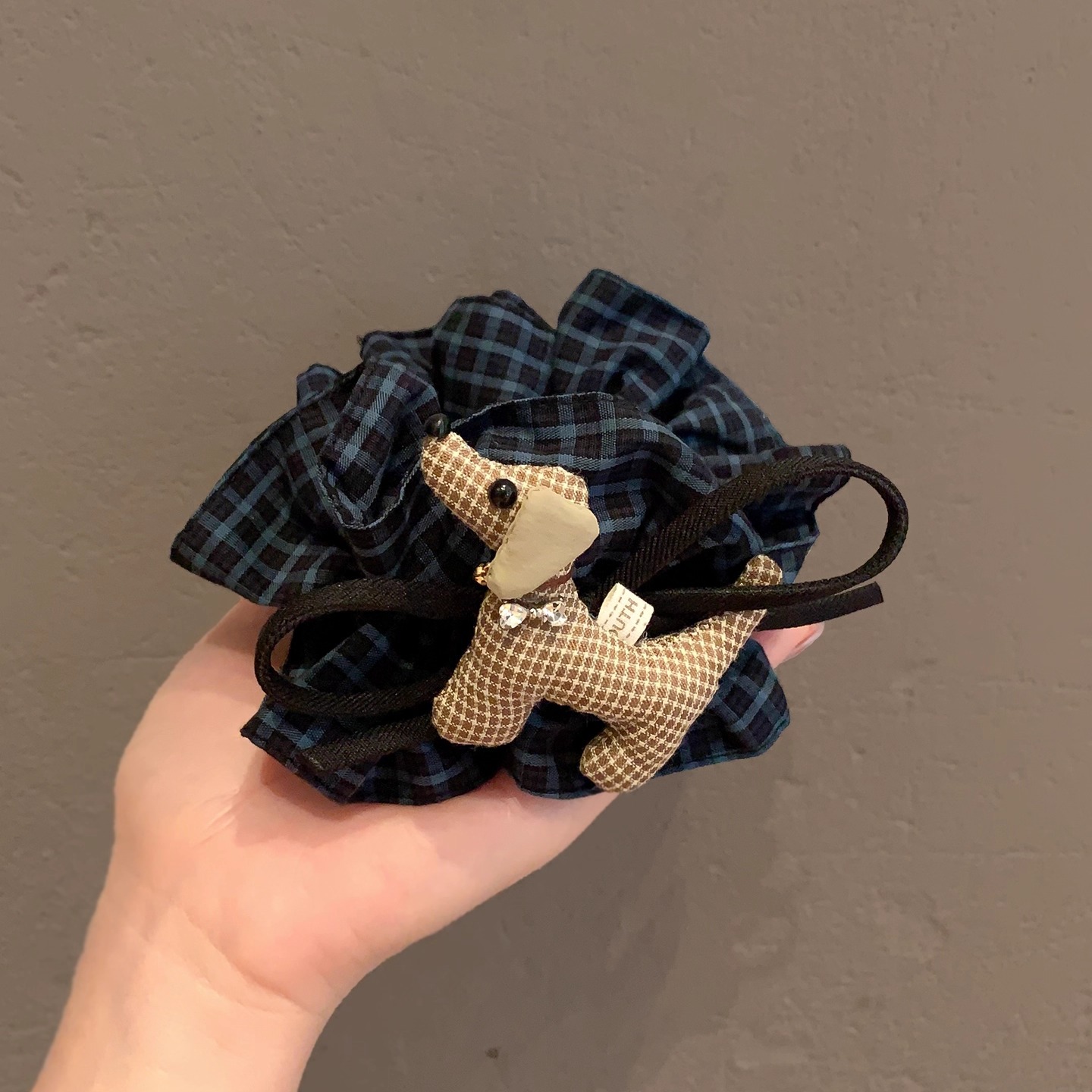 时尚黑青格纹布艺大肠发圈扎马尾可爱小狗蝴蝶结发绳头饰复古头绳