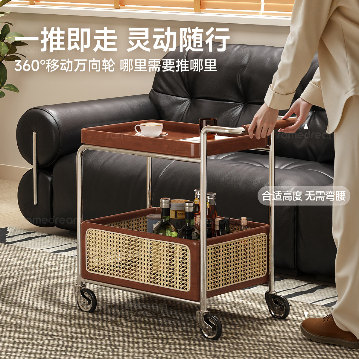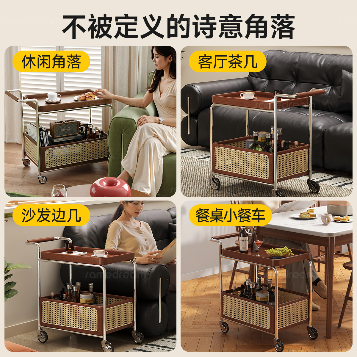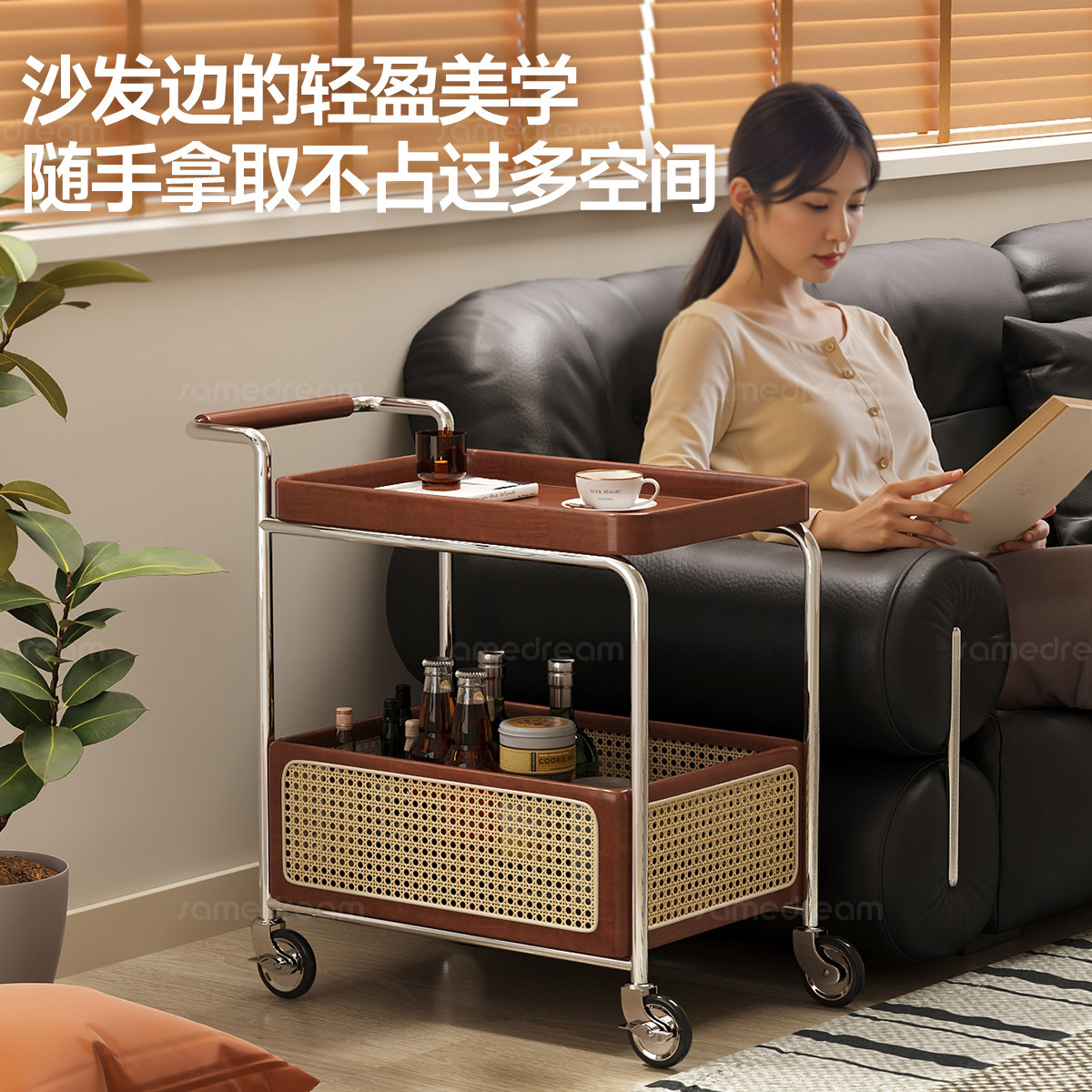 沙发边几可移动茶几客厅家用中古风小推车实木边柜桌子收纳置物架