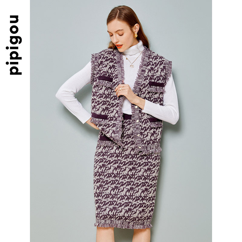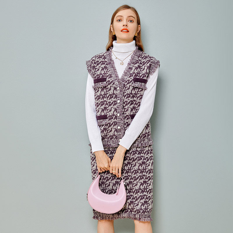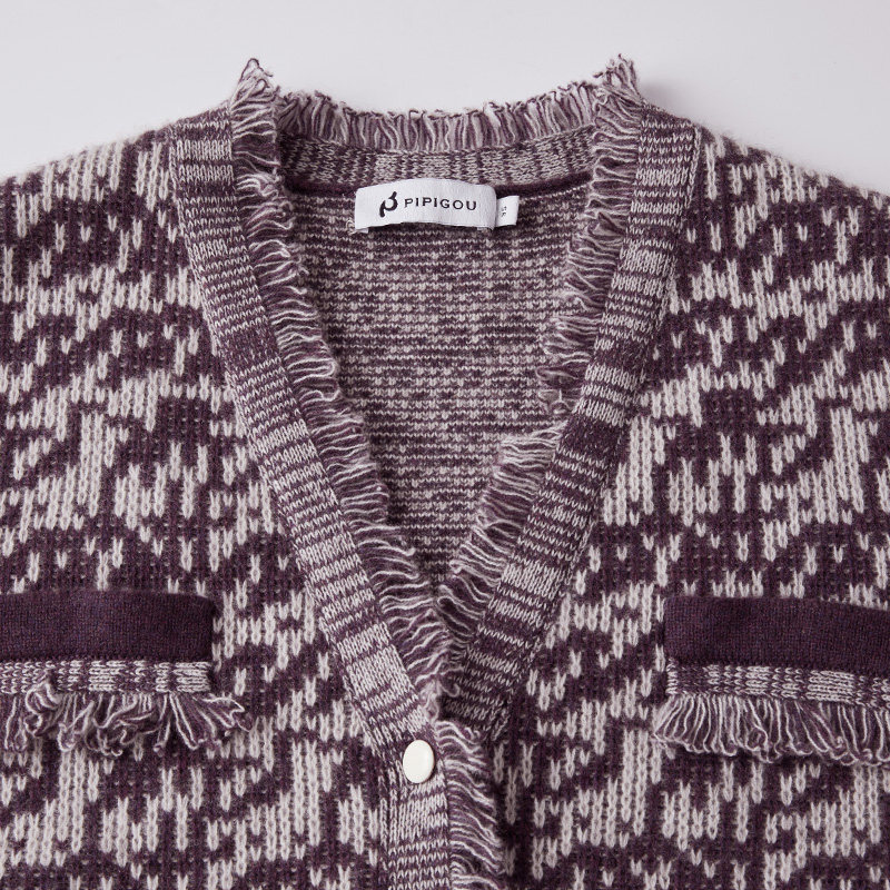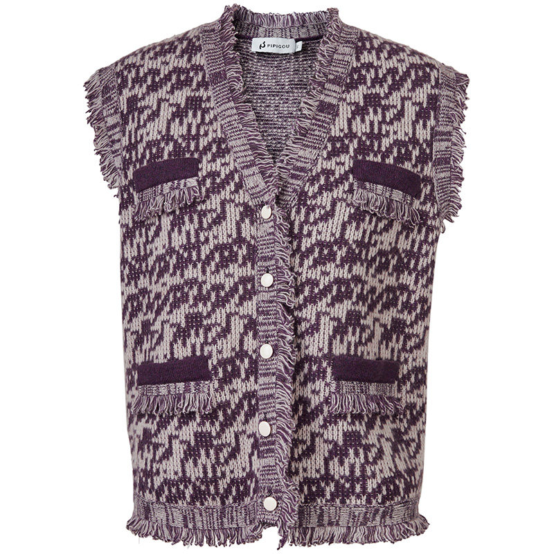 皮皮狗商场同款女士提花V领女开衫纯羊绒背心马甲