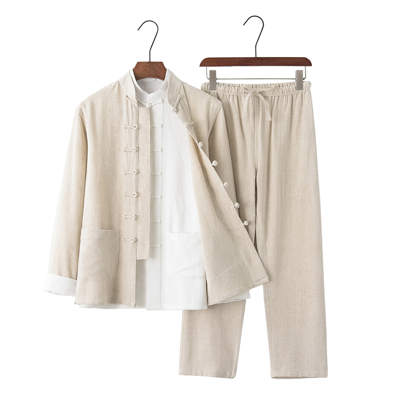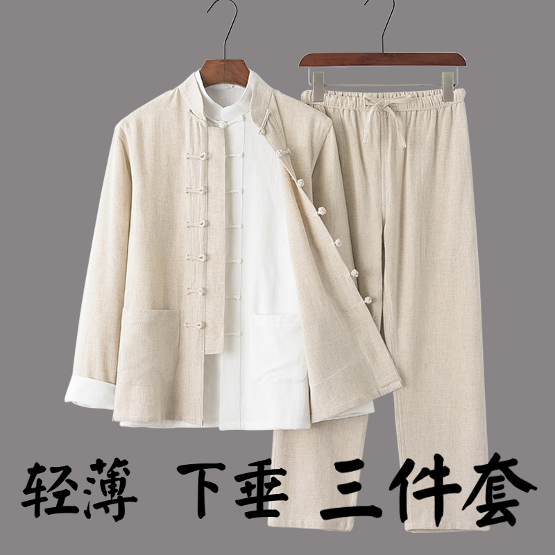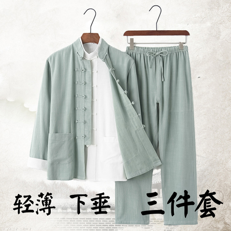 中国风唐装中老年长袖套装中式汉服休闲男装夏季薄款三件套爸爸装