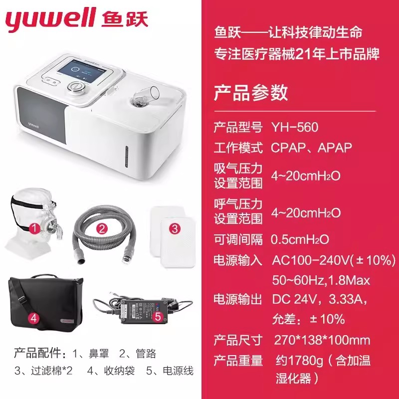 鱼跃呼吸机家用单水平全自动无创老人睡眠呼暂停打呼噜专用YH560