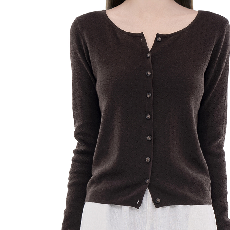 BM开衫女2025新款春秋棕色孔眼圆领修身显瘦复古百搭长袖针织开衫