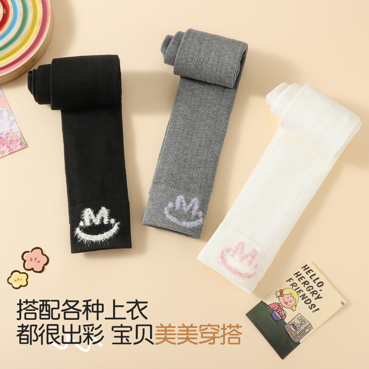 梦芭蒂秋冬时尚儿童打底裤连裤袜女可爱笑脸高弹舒适不掉裆新款