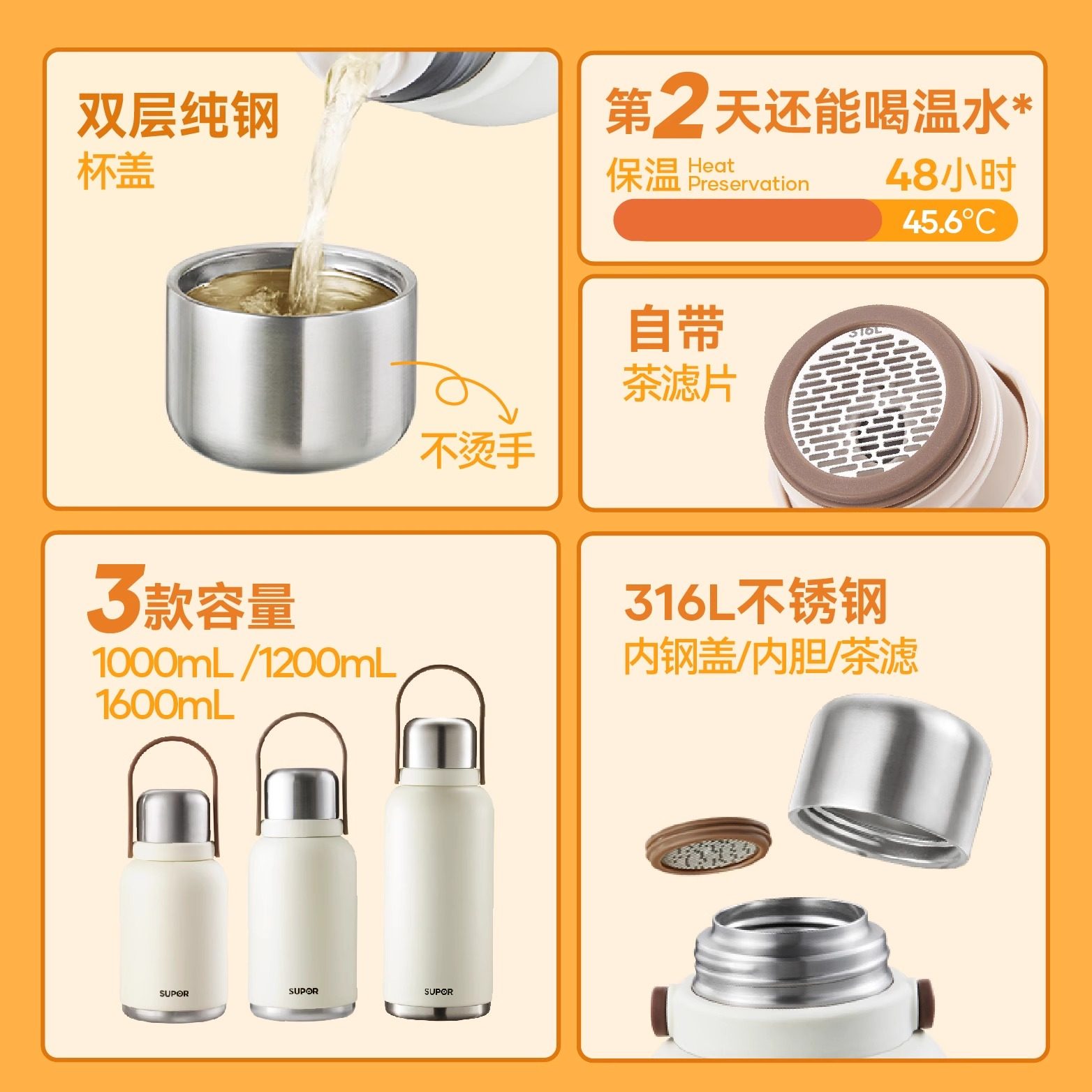 苏泊尔保温杯大容量水杯大号水壶女款婴儿冲奶外出携带官方旗舰店