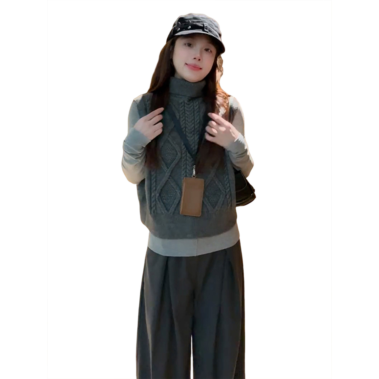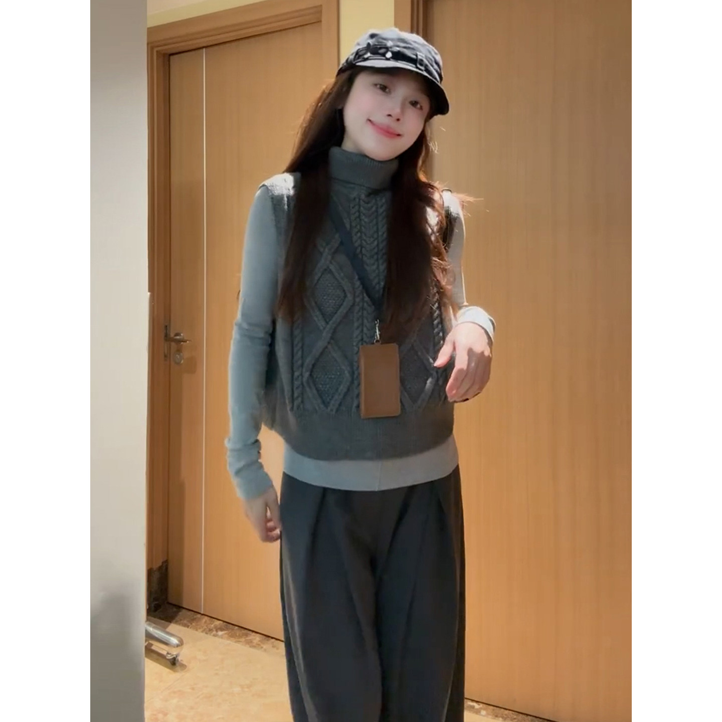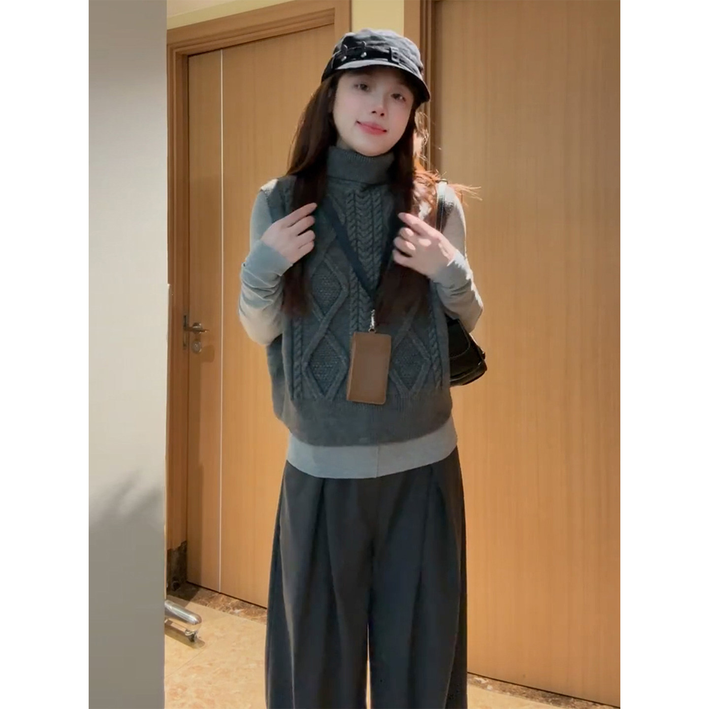 韩系深灰色高领针织马甲女秋冬季设计感前后两穿毛衣背心叠穿上衣