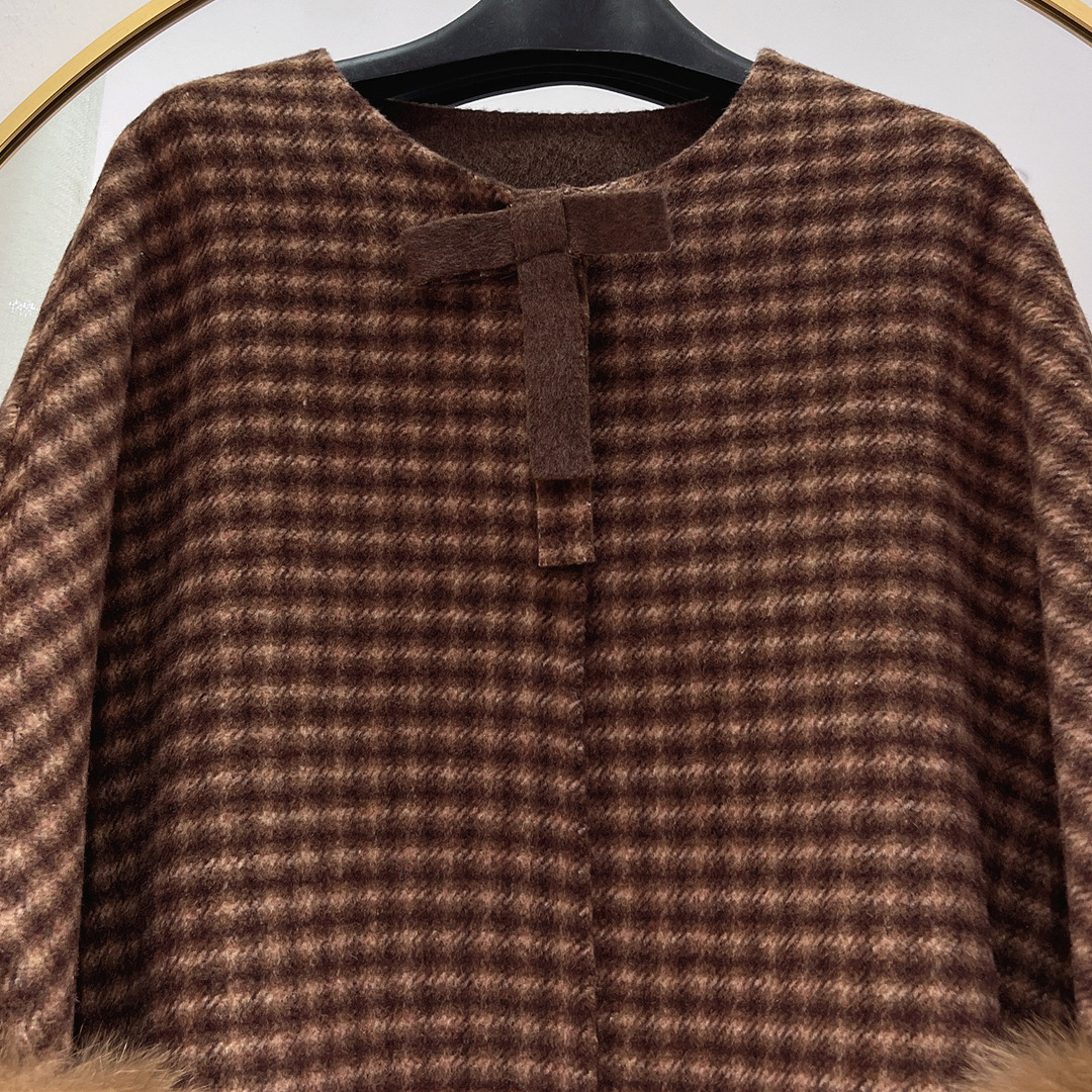 2025秋冬新款狐狸毛袖双面羊绒大衣女短款披肩格子羊毛外套