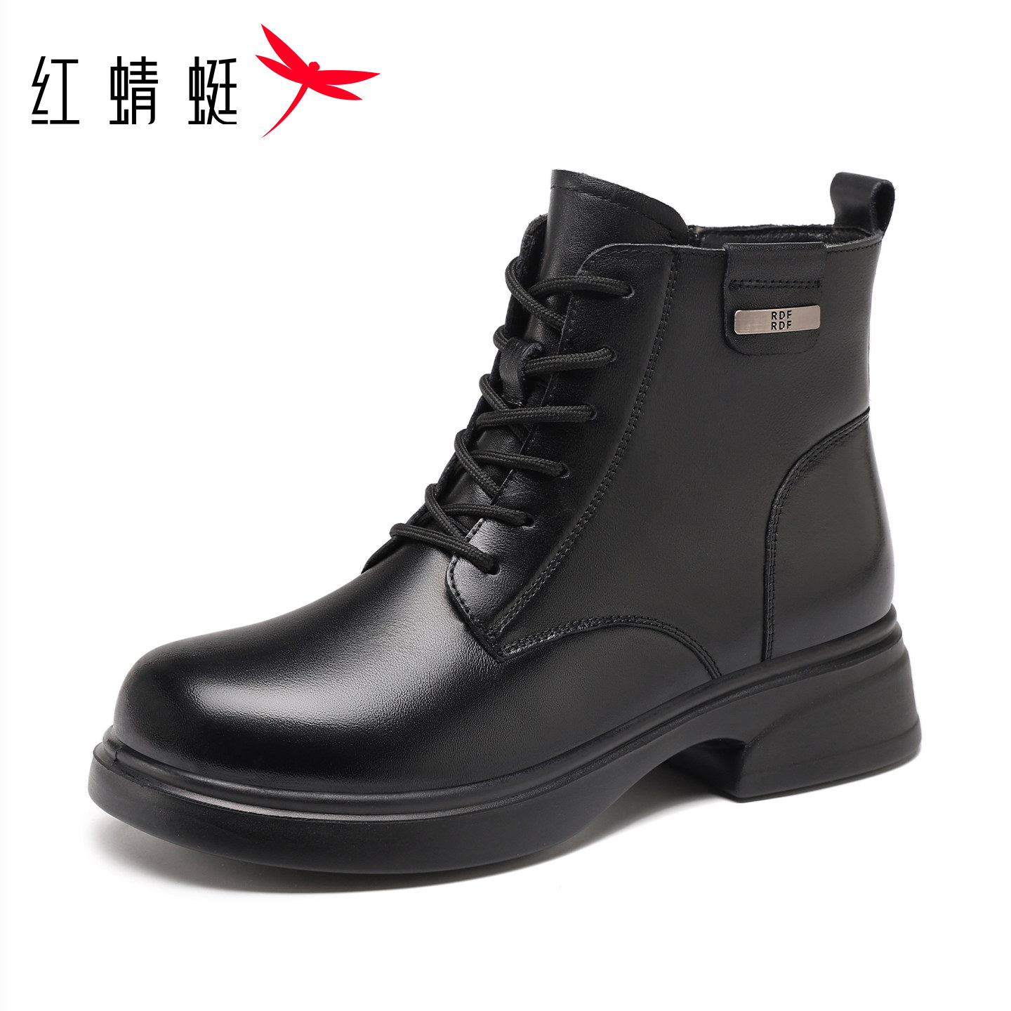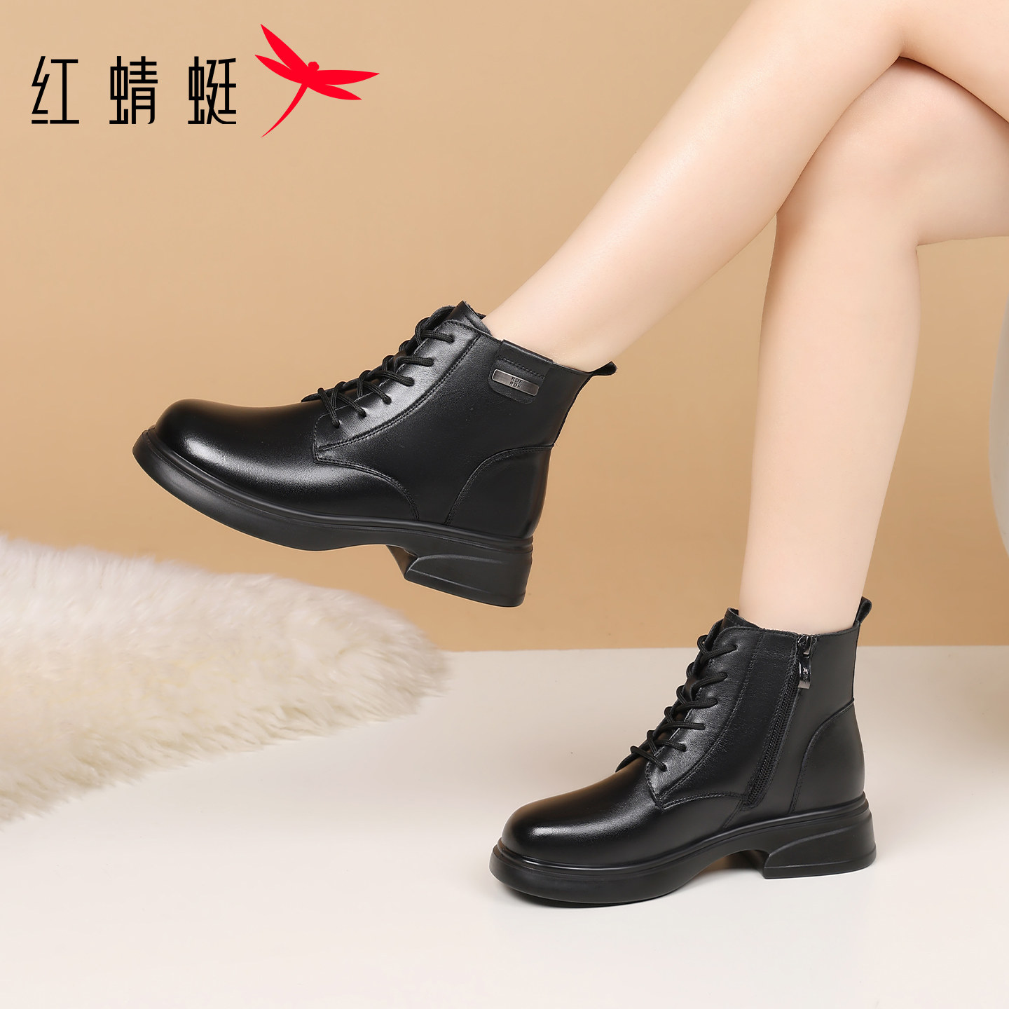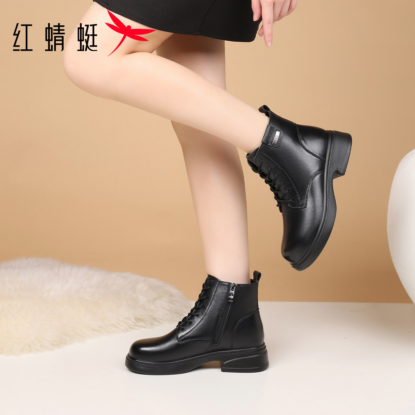 红蜻蜓女鞋冬季靴子女士中筒厚底马丁靴女款新款真皮加绒保暖短靴