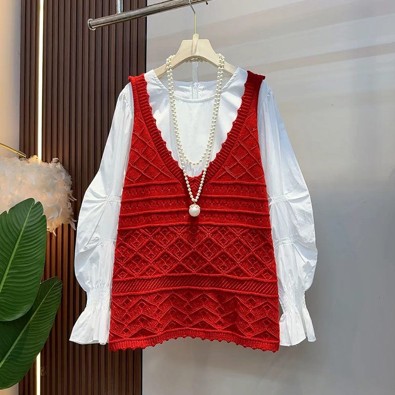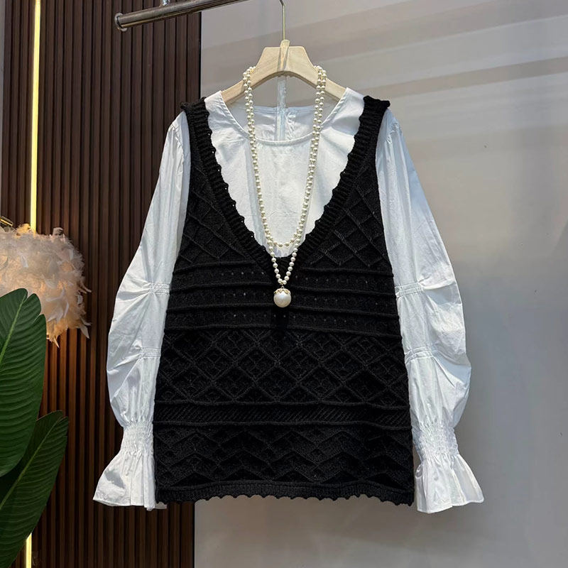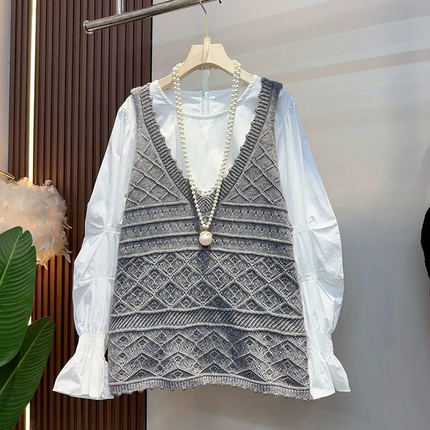 加大码女装V领针织马甲胖妹妹韩版小众设计减龄百搭微喇袖口衬衫