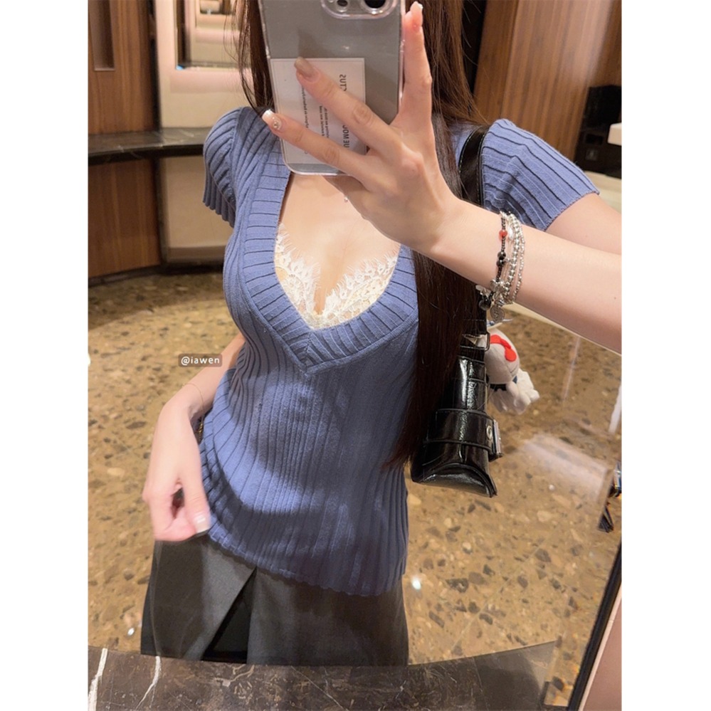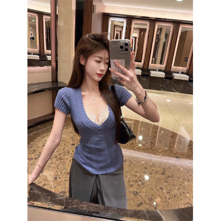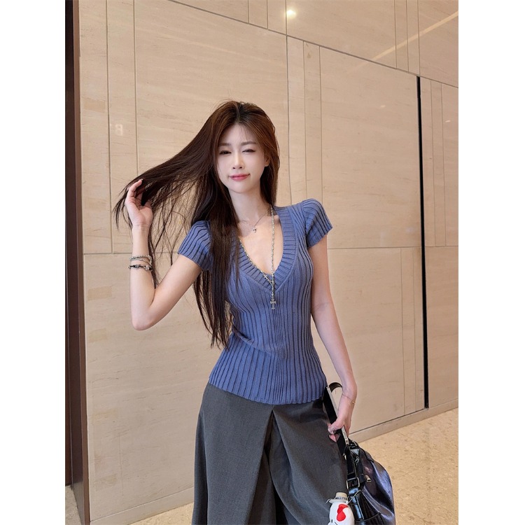 胖mm纯欲性感v领坑条高弹通勤百搭掐腰上衣+宽松阔腿裤休闲两件套