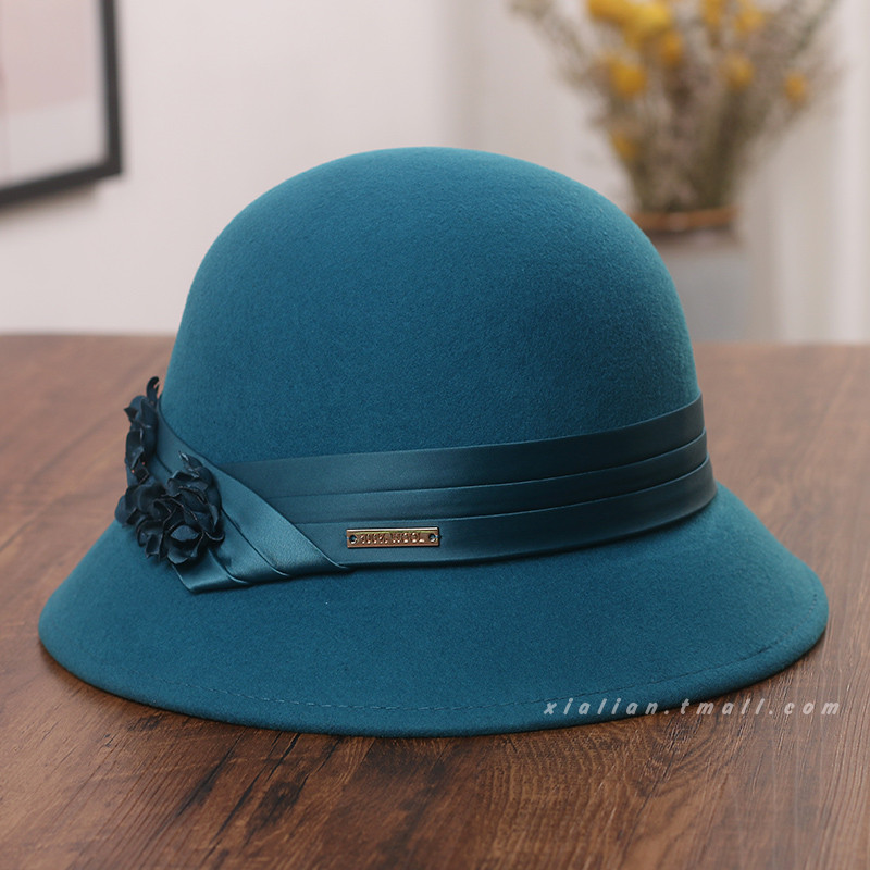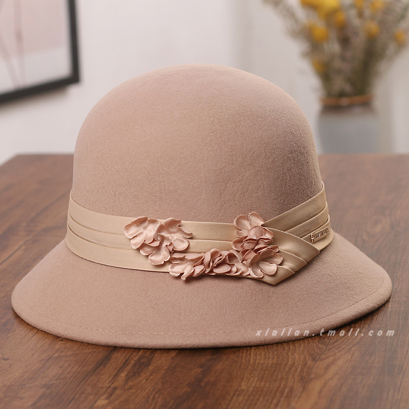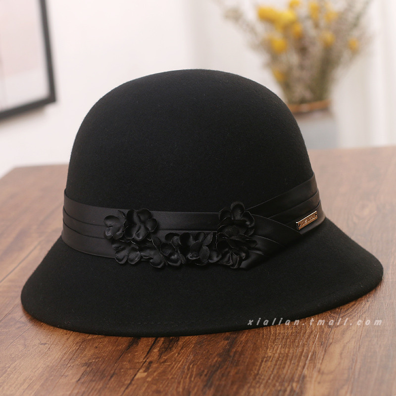 帽子女士秋冬羊毛呢毡帽优雅花朵名媛礼帽英伦复古保暖盆帽渔夫帽