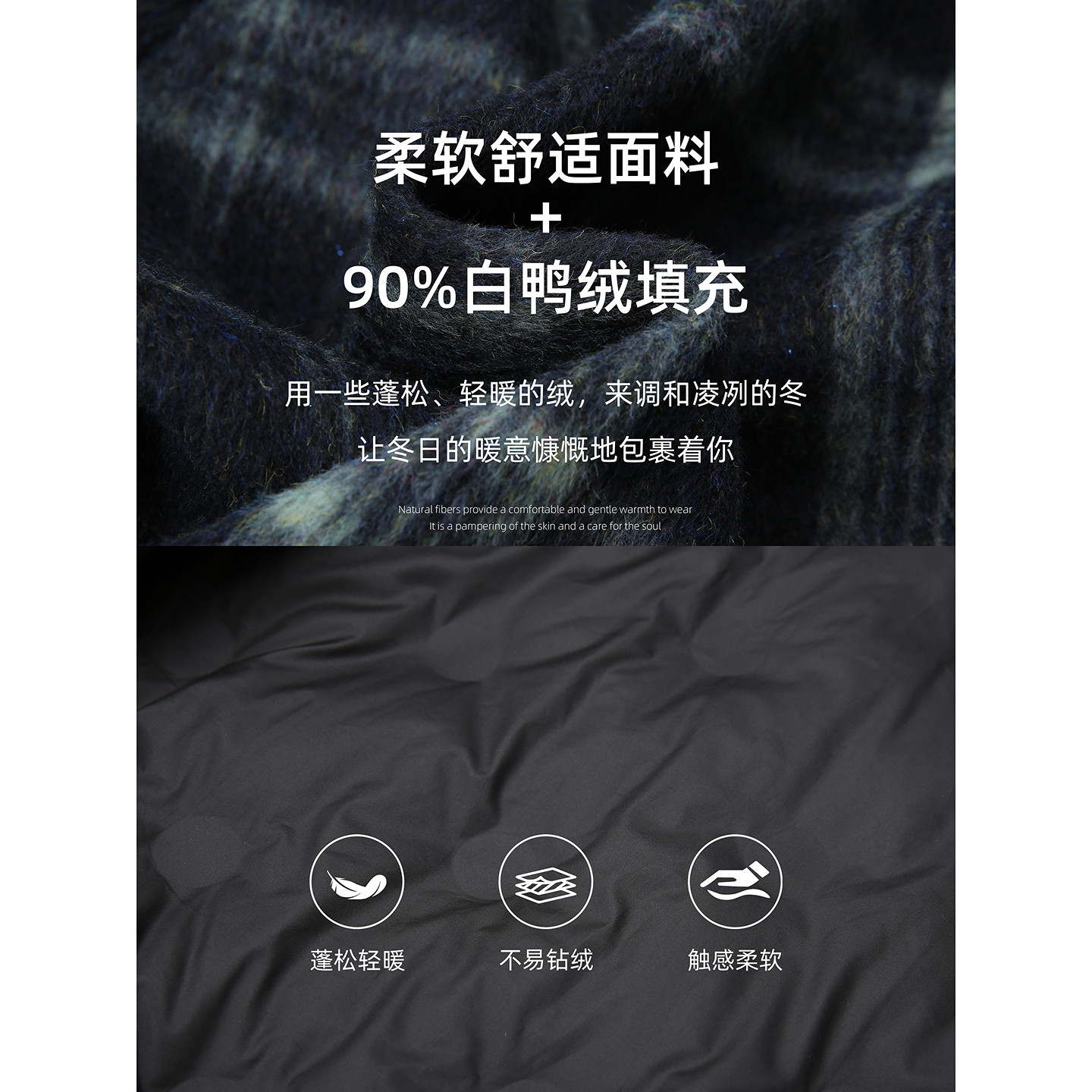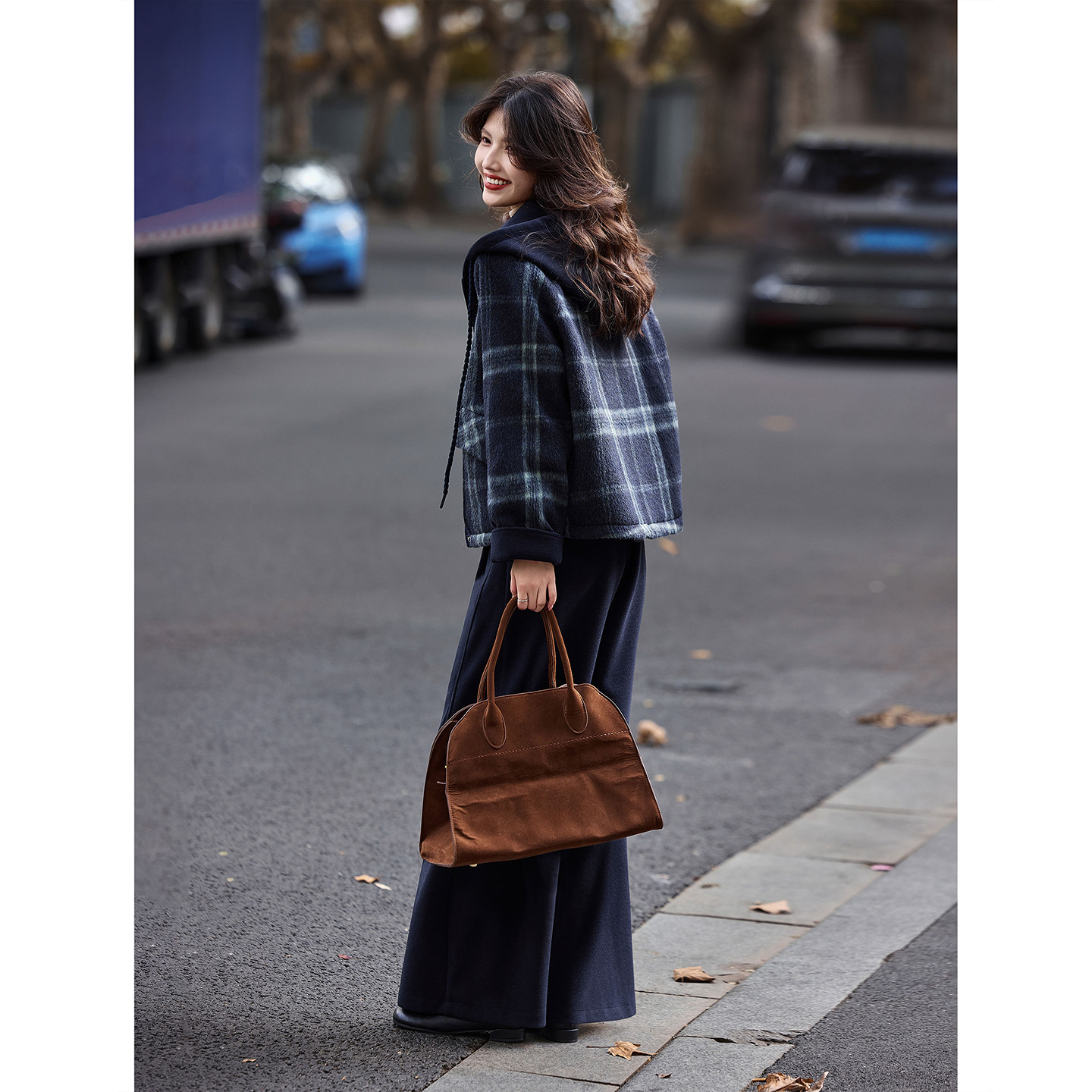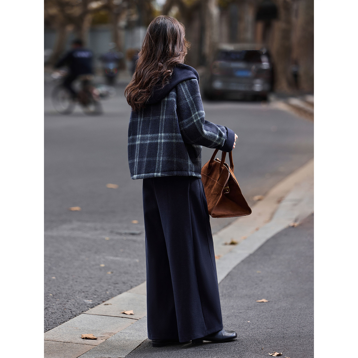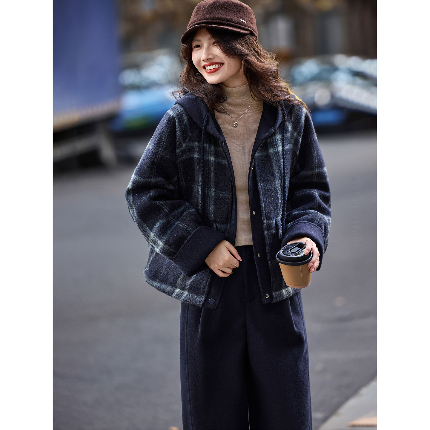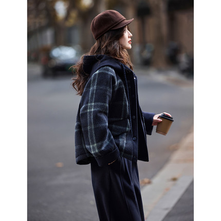 苏醒的乐园90白鸭绒冬季时尚连帽毛呢格子外套阔腿休闲裤套装