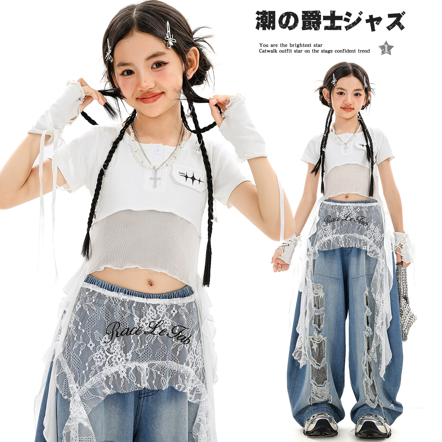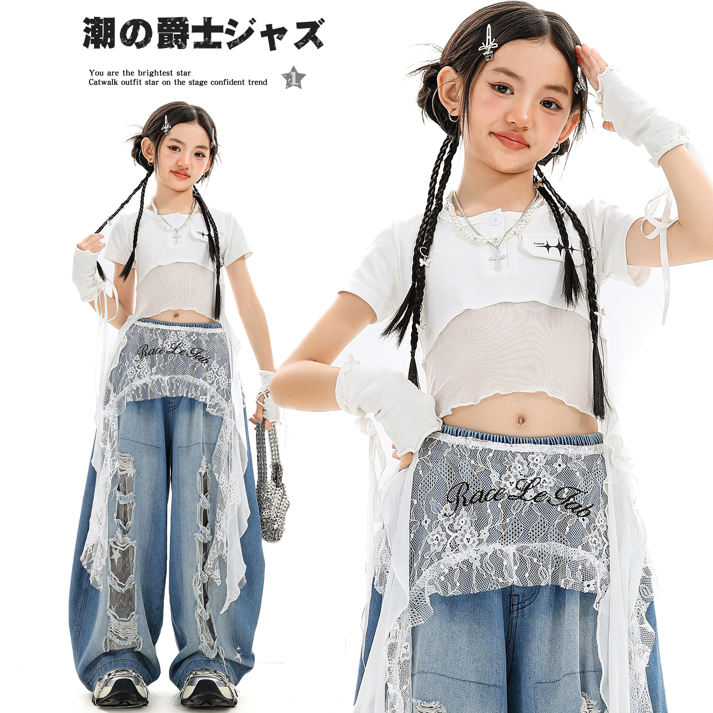 女童爵士舞网纱飘带短袖拼蕾丝破洞牛仔裤甜酷辣妹儿童街舞演出服