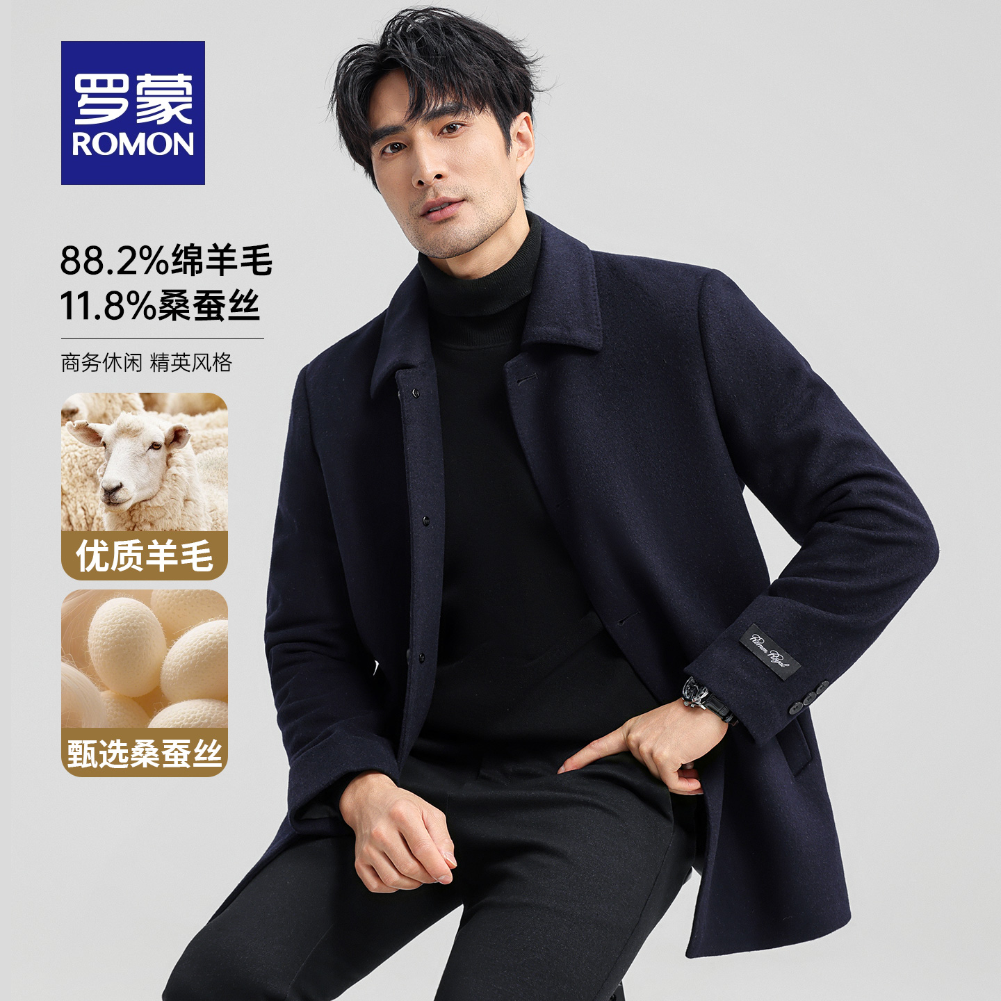 【含绵羊毛+桑蚕丝】罗蒙男士轻奢翻领毛呢大衣2025秋季新款外套