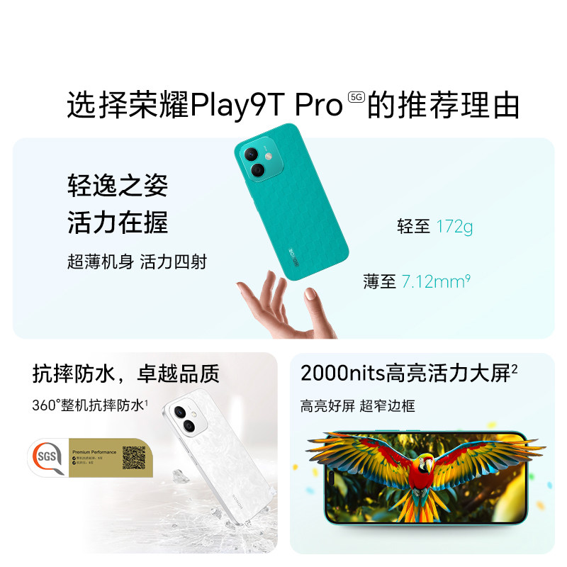 HONOR/荣耀Play9T Pro 智能手机超薄机身抗摔防水2000nits高亮活力大屏官方国补手机