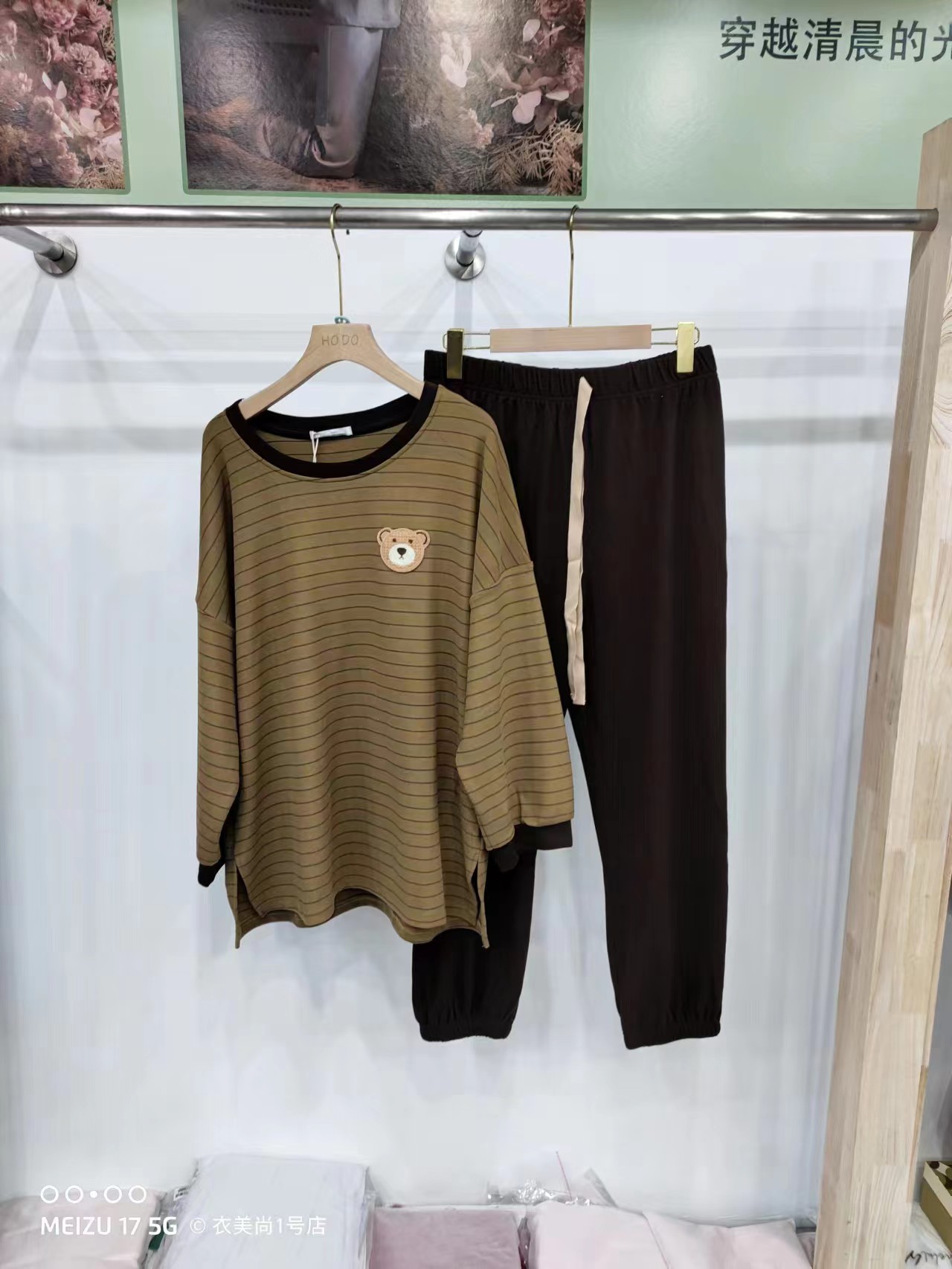 秋冬新款女士刺绣熊条纹家居服套装长袖长裤圆领休闲舒适睡衣1163
