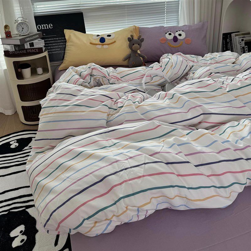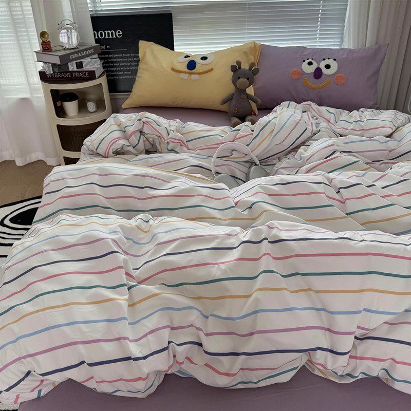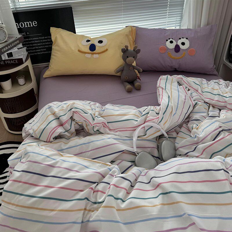 多巴胺少女奶紫条纹配大眼毛巾绣四件套水洗棉被套学生床单三件套