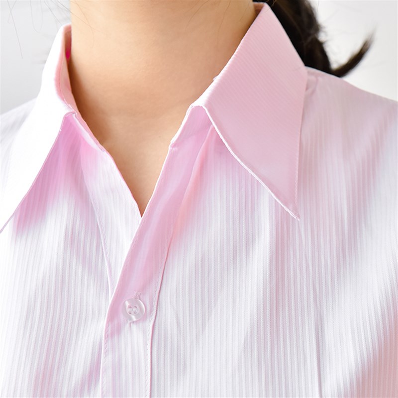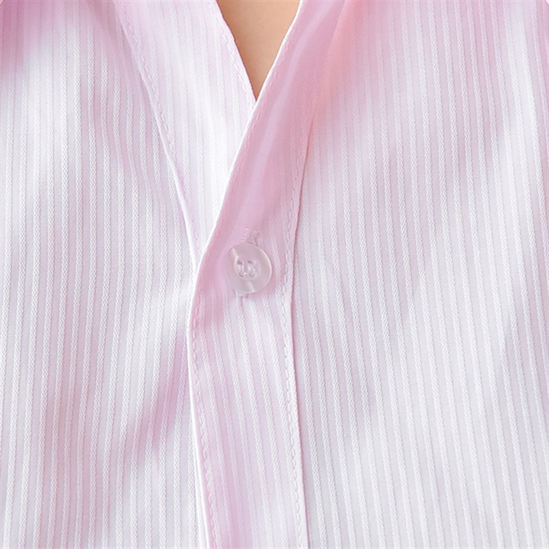 包邮白衬衫女修身收腰V领细竖条纹衬衣短袖职业OL长袖工作服蓝色