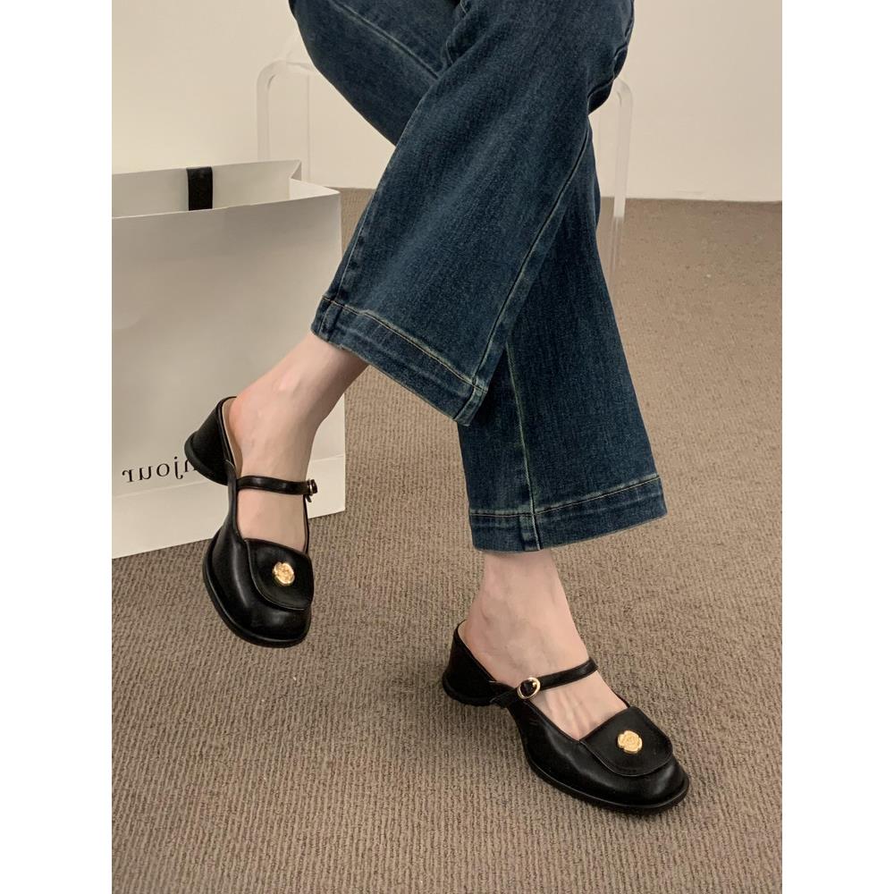 法式复古小香风粗跟包头半拖鞋女外穿一字扣带玛丽珍高跟鞋穆勒鞋