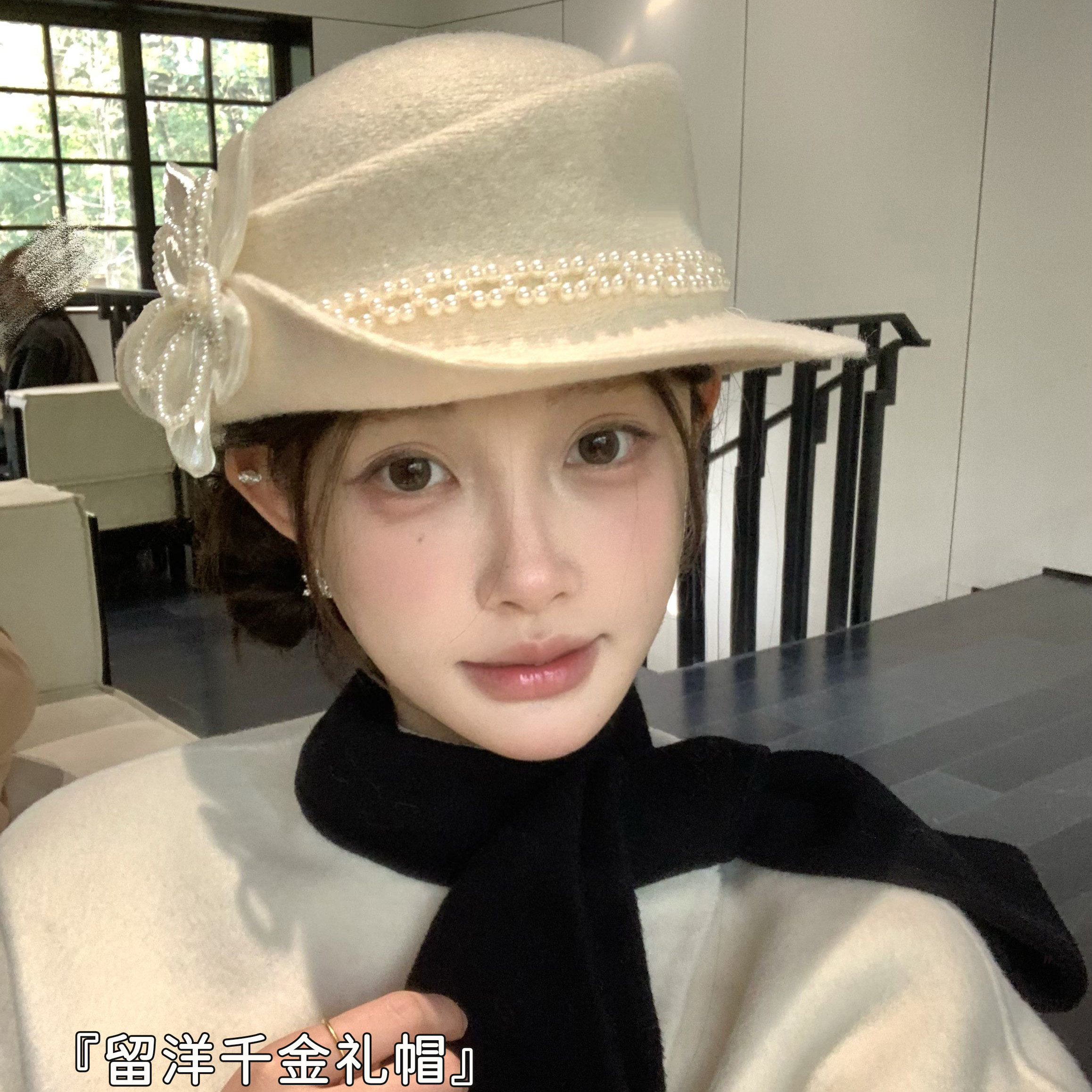 留洋千金高端羊毛仿珍珠卷边玫瑰花礼帽优雅气质气质高级感盆帽女